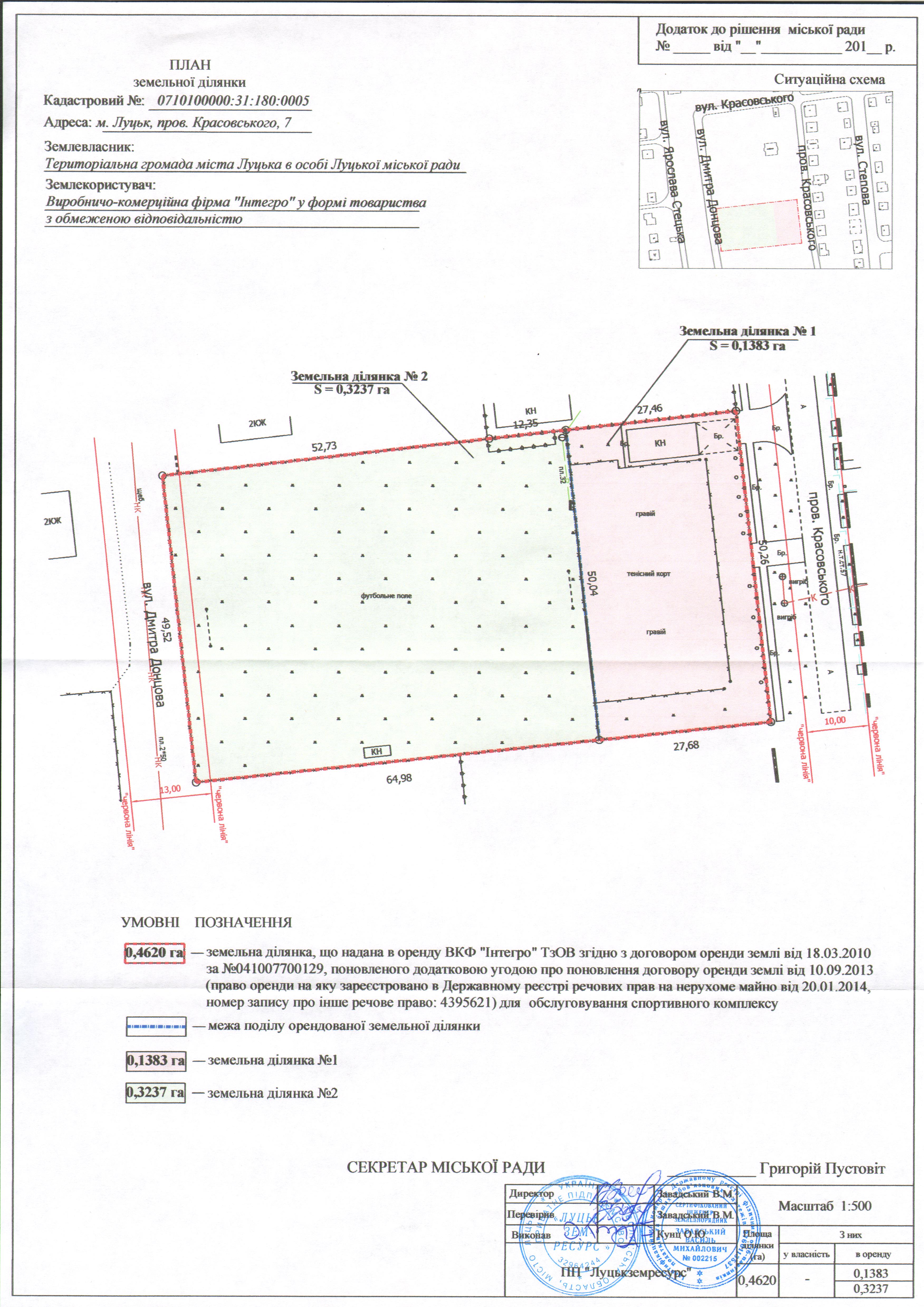 Про надання ВКФ «Інтегро» ТзОВ згоди на поділ орендованої земельної ділянки на пров. Красовського, 7 (загальна площа 0,4620 га: земельна ділянка 1 – 0,1383 га, земельна ділянка 2 – 0,3237 га).