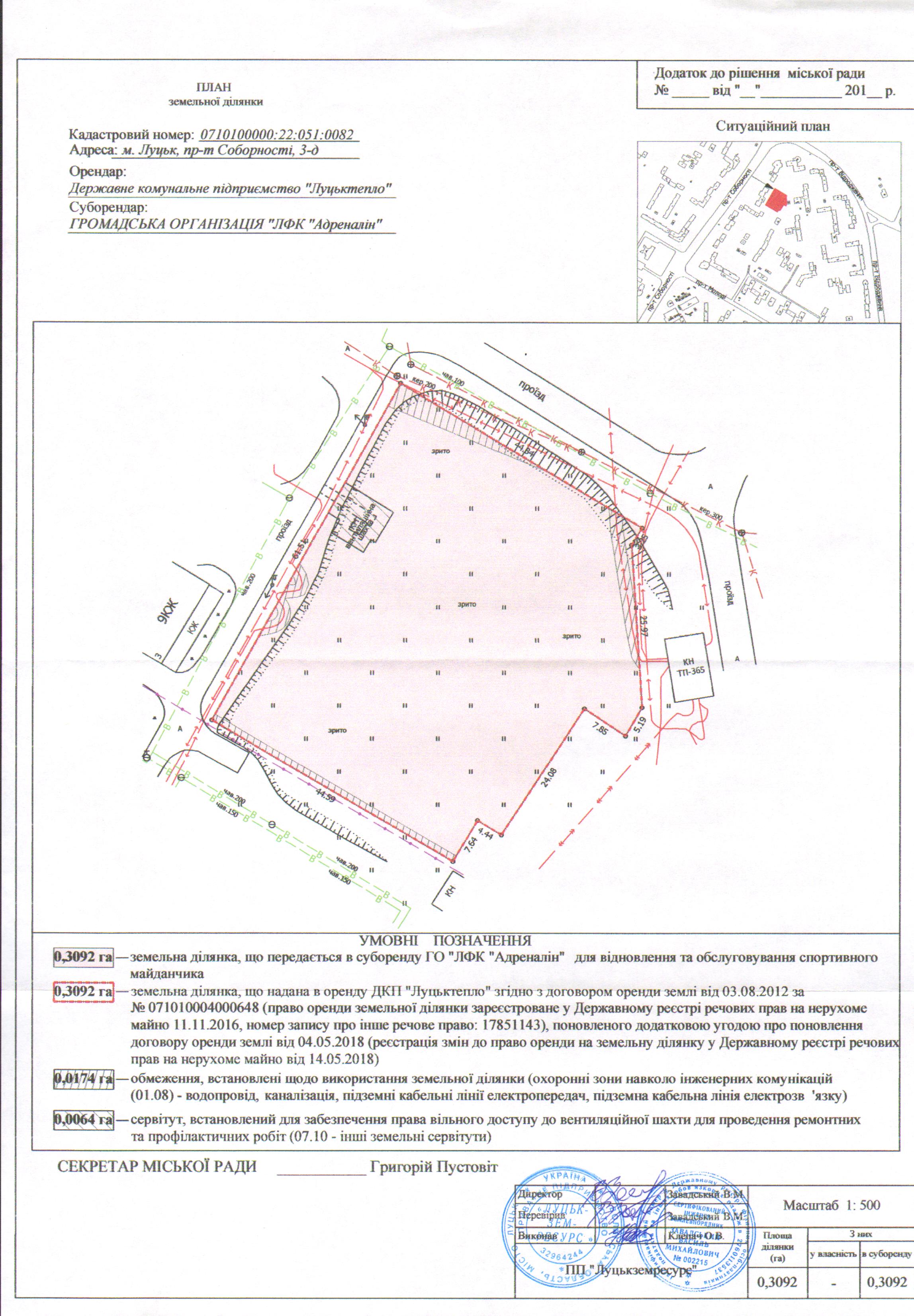 2. Погодити договір суборенди земельної ділянки, укладений між державним комунальним підприємством «Луцьктепло» та ГРОМАДСЬКОЮ ОРГАНІЗАЦІЄЮ «ЛФК «Адреналін», на вказаних в даному рішенні умовах, а також оформити інші документи, необхідні для вчинення цієї угоди.