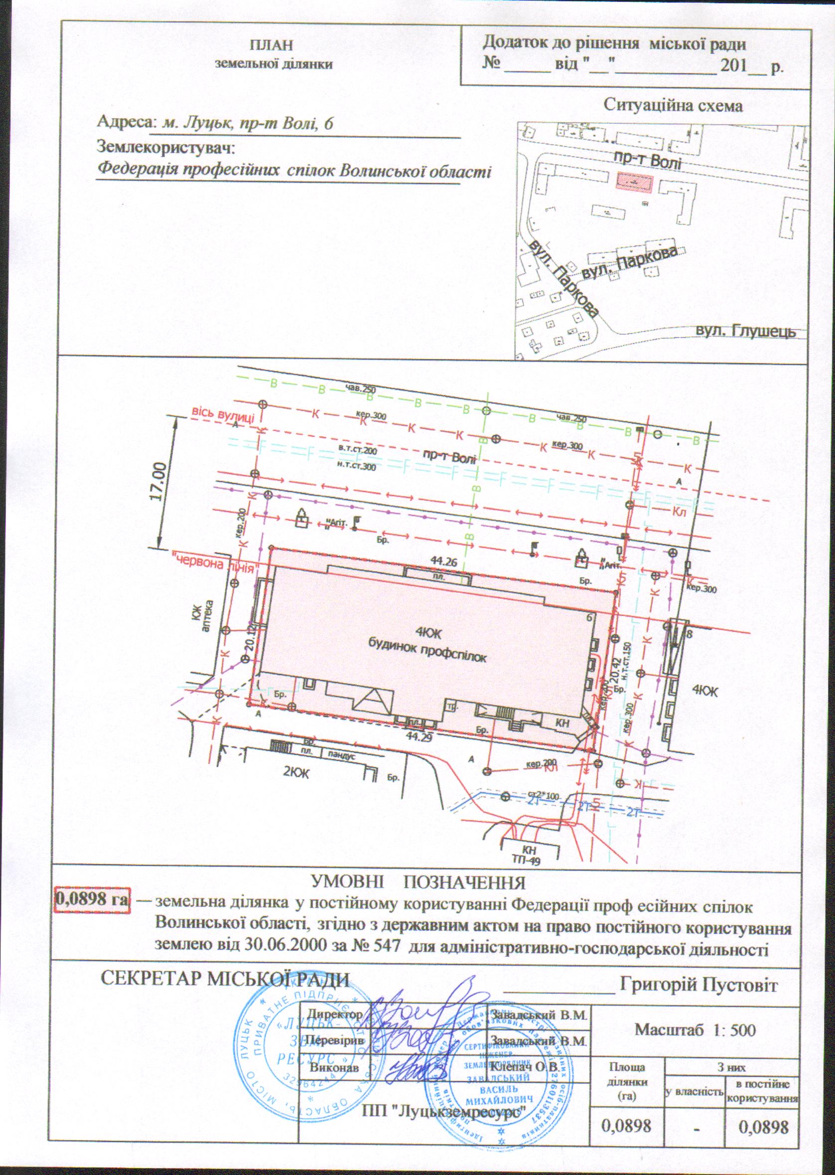 Розглянувши заяву Федерації професійних спілок Волинської області про надання згоди на відновлення меж земельної ділянки комунальної власності на пр-ті Волі, 6, площею 0,0898 га для адміністративно-господарської діяльності, державний акт на право постійного користування землею серії I-ВЛ №001027, зареєстрований в Книзі записів державних актів на право постійного користування землею від 30.06.2000 за №547, інформацію Головного управління Державної фіскальної служби у Волинській області щодо відсутності заборгованості зі сплати податку за землю, статут Федерації професійних спілок Волинської області, свідоцтво про право власності на адміністративне приміщення з вбудованим кафе, витяг про реєстрацію права власності на нерухоме майно та технічний паспорт на об’єкт нерухомого майна, керуючись статтями 12, 79-1, 92, 96, 116, 122, 123 Земельного кодексу України, Законом України «Про землеустрій», Законом України «Про державну реєстрацію речових прав на нерухоме майно та їх обтяжень», Законом України «Про Державний земельний кадастр», Постановою Кабінету Міністрів України від 17.10.2012 № 1051 «Про затвердження Порядку ведення Державного земельного кадастру», п. 6 Прикінцевих та перехідних положень Закону України «Про внесення змін до деяких законодавчих актів України щодо розмежування земель державної та комунальної власності», ст. 26 Закону України «Про місцеве самоврядування в Україні», міська рада