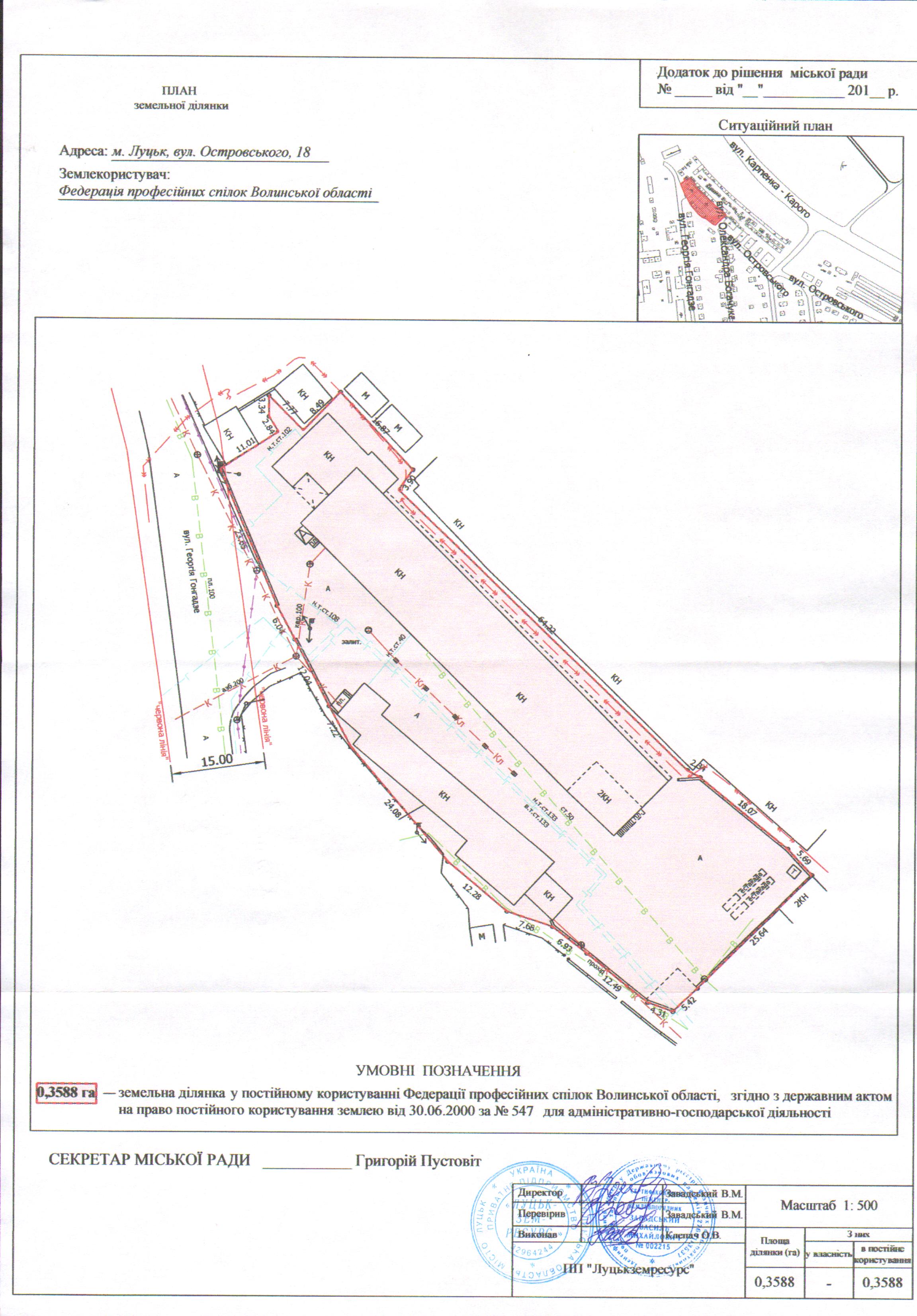 Розглянувши заяву Федерації професійних спілок Волинської області про надання згоди на відновлення меж земельної ділянки комунальної власності на вул. Островського, 18, площею 0,3588 га для адміністративно-господарської діяльності, державний акт на право постійного користування землею серії I-ВЛ №001027, зареєстрований в Книзі записів державних актів на право постійного користування землею від 30.06.2000 за №547, інформацію Головного управління Державної фіскальної служби у Волинській області щодо відсутності заборгованості зі сплати податку за землю, статут Федерації професійних спілок Волинської області, свідоцтва про право власності, технічні паспорти на об’єкти нерухомого майна, керуючись статтями 12, 79-1, 92, 96, 116, 122, 123 Земельного кодексу України, Законом України «Про землеустрій», Законом України «Про державну реєстрацію речових прав на нерухоме майно та їх обтяжень», Законом України «Про Державний земельний кадастр», Постановою Кабінету Міністрів України від 17.10.2012 № 1051 «Про затвердження Порядку ведення Державного земельного кадастру», п. 6 Прикінцевих та перехідних положень Закону України «Про внесення змін до деяких законодавчих актів України щодо розмежування земель державної та комунальної власності», ст. 26 Закону України «Про місцеве самоврядування в Україні», міська рада