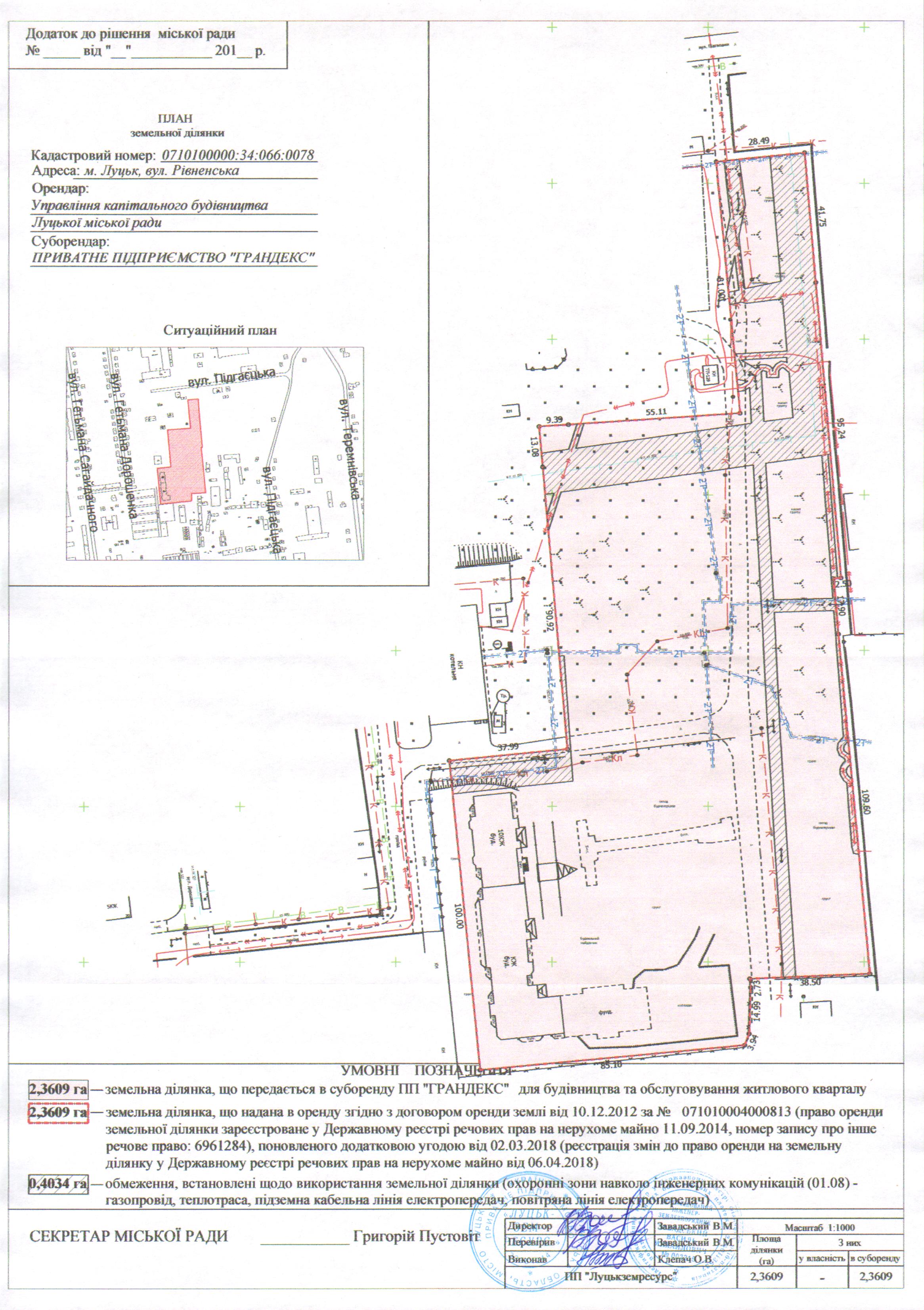 1. Надати згоду управлінню капітального будівництва Луцької міської ради на передачу орендованої земельної ділянки кадастровим номером 0710100000:34:066:0078 на вул. Рівненській, площею 2,3609 га, в суборенду ПРИВАТНОМУ ПІДПРИЄМСТВУ «ГРАНДЕКС» для будівництва та обслуговування житлового кварталу, згідно з додатком.
