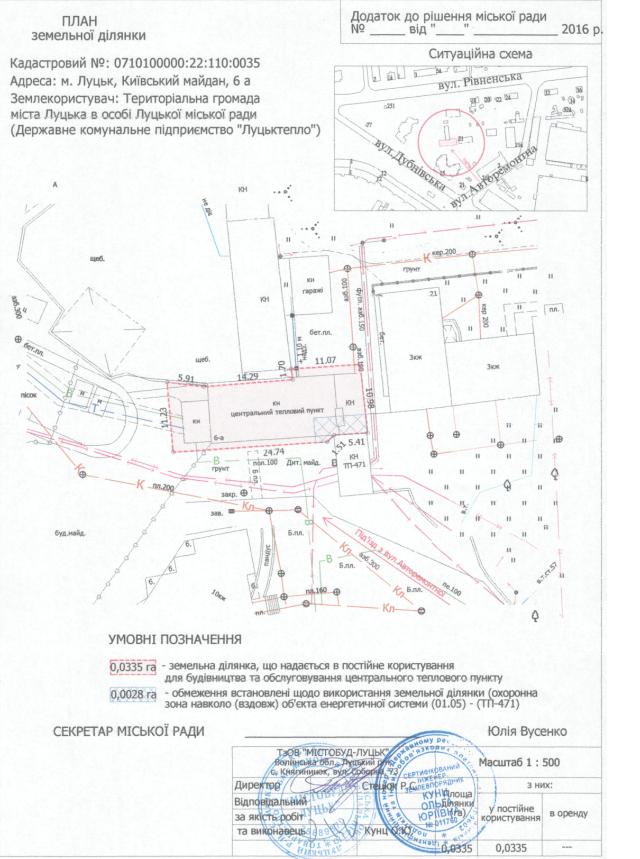 2. Надати в постійне користування Державному комунальному підприємству “Луцьктепло” земельну ділянку на Київському майдані, 6а, площею 0,0335 га, кадастровим номером 0710100000:22:110:0035 для будівництва та обслуговування центрального теплового пункту, згідно з додатком.
