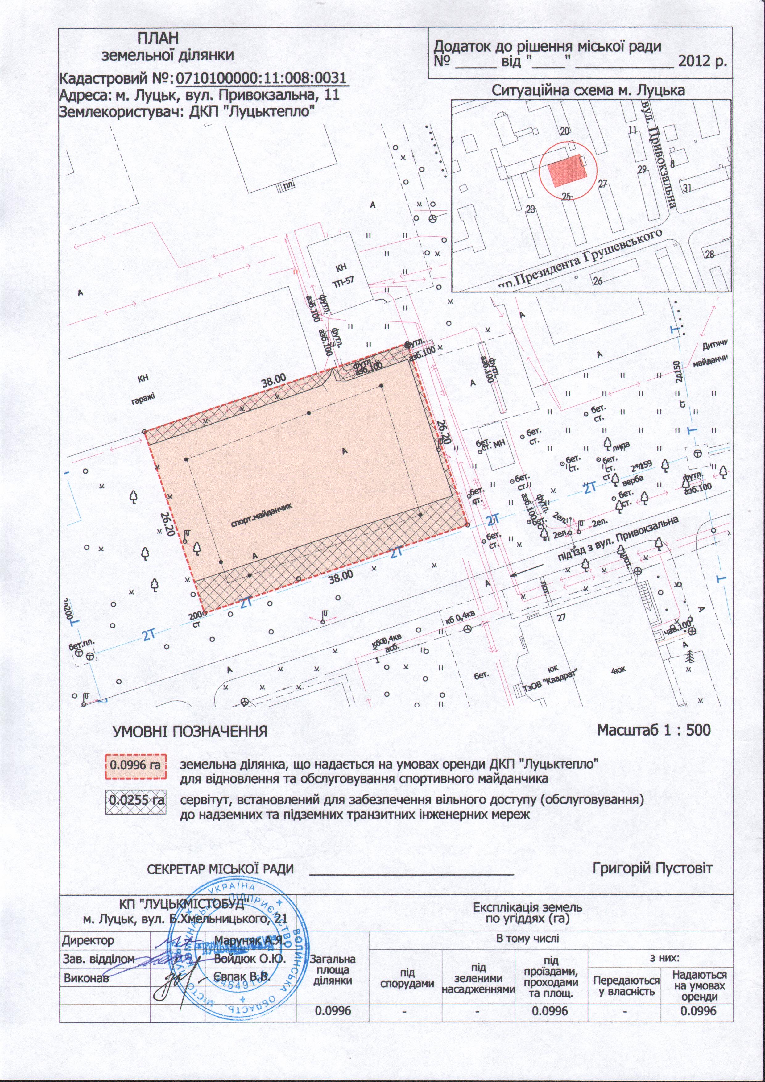 3. Укласти з державним комунальним підприємством «Луцьктепло» договір оренди земельної ділянки на вул. Привокзальній, 11 на вказаних в даному рішенні умовах, а також оформити інші документи, необхідні для вчинення цієї угоди.