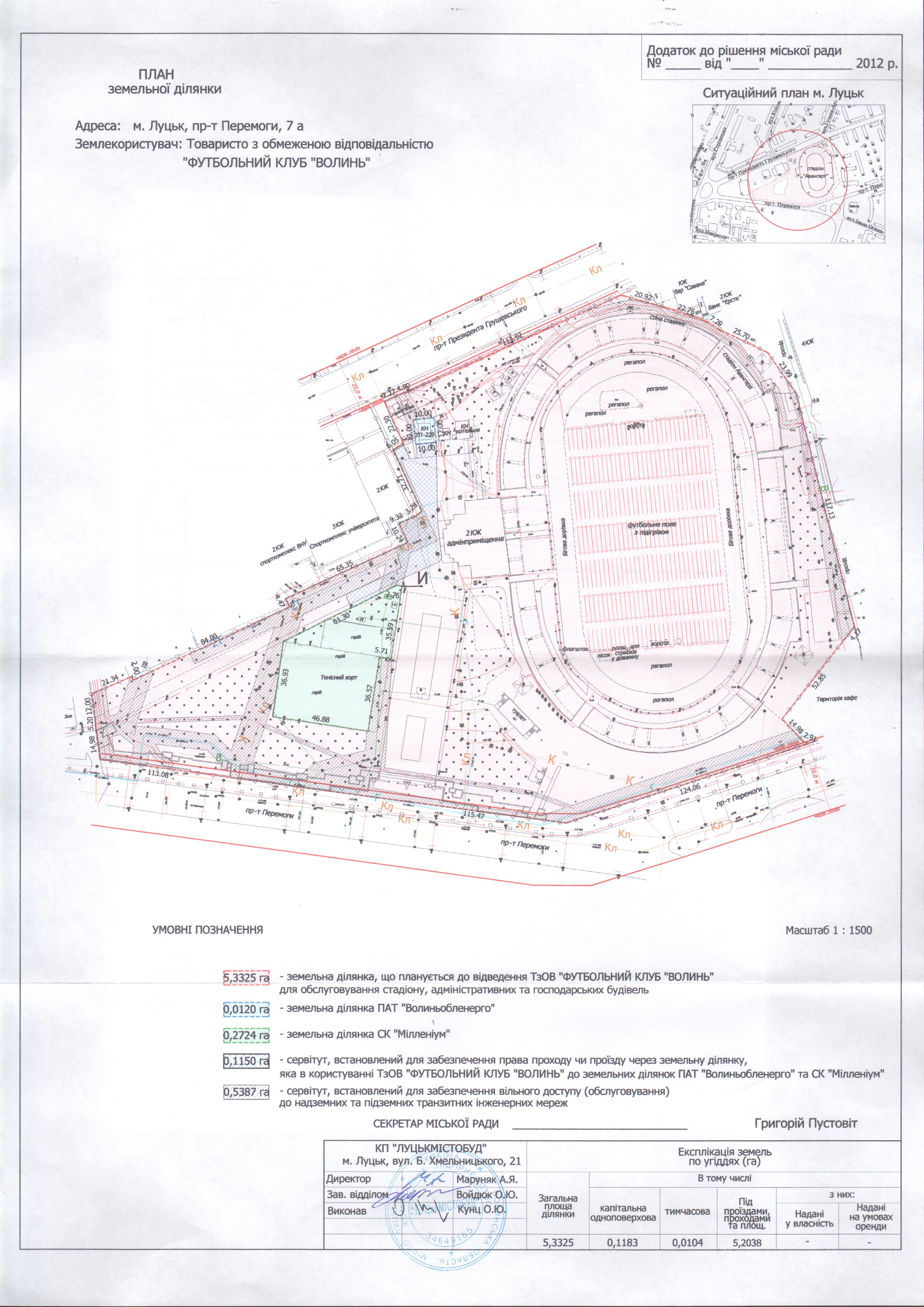 1. Надати товариства з обмеженою відповідальністю «ФУТБОЛЬНИЙ КЛУБ «ВОЛИНЬ» дозвіл на розроблення проекту землеустрою щодо відведення земельної ділянки на умовах оренди для обслуговування стадіону, адміністративних та господарських будівель на пр-ті Перемоги, 7а площею 5,3325 га за рахунок земель міста, не наданих у власність чи користування, згідно з додатком.