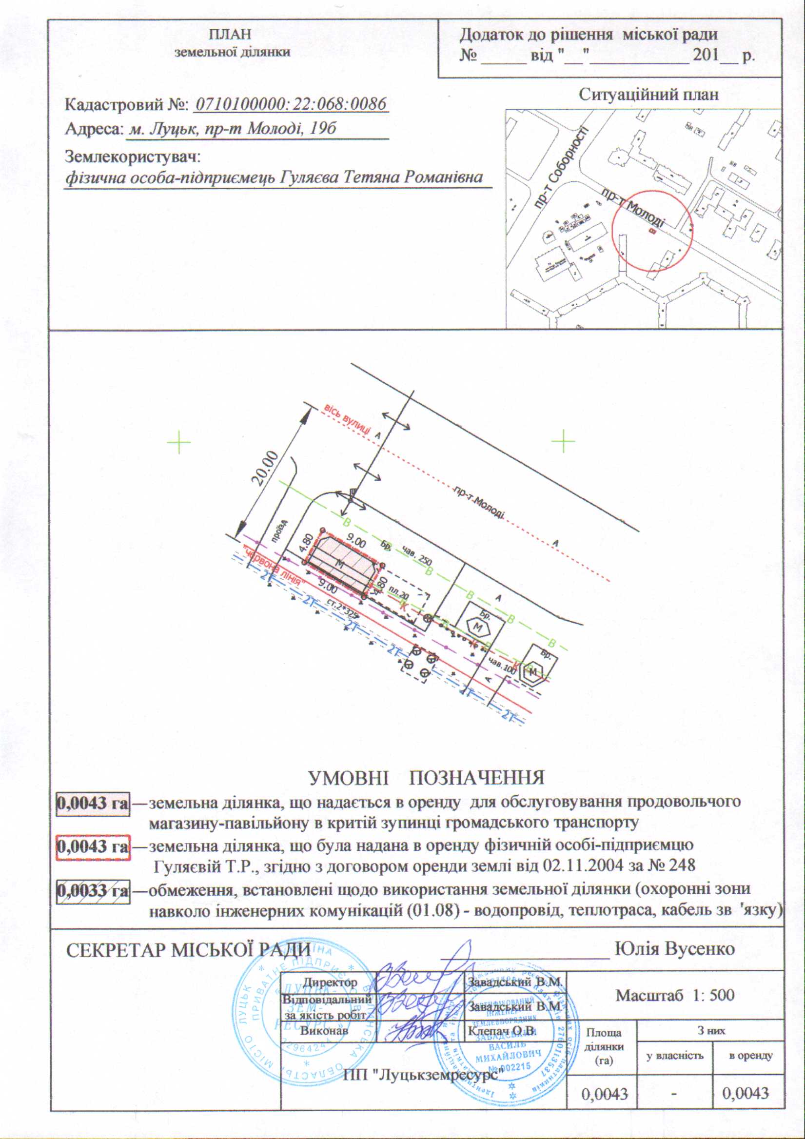 2. Надати фізичній особі-підприємцю Гуляєвій Тетяні Романівні земельну ділянку на пр-ті Молоді, 19б, на умовах оренди строком на 5 років, площею 0,0043 га, кадастровим номером 0710100000:22:068:0086, для обслуговування продовольчого магазину-павільйону в критій зупинці громадського транспорту, згідно з додатком.