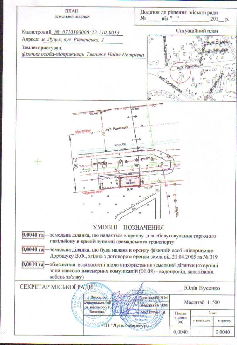 2. Надати фізичній особі-підприємцю Тивонюк Надії Петрівні земельну ділянку на вул. Рівненській, 2, на умовах оренди строком на 5 років, площею 0,0040 га, кадастровим номером 0710100000:22:110:0013, для обслуговування торгового павільйону в критій зупинці громадського транспорту, згідно з додатком.