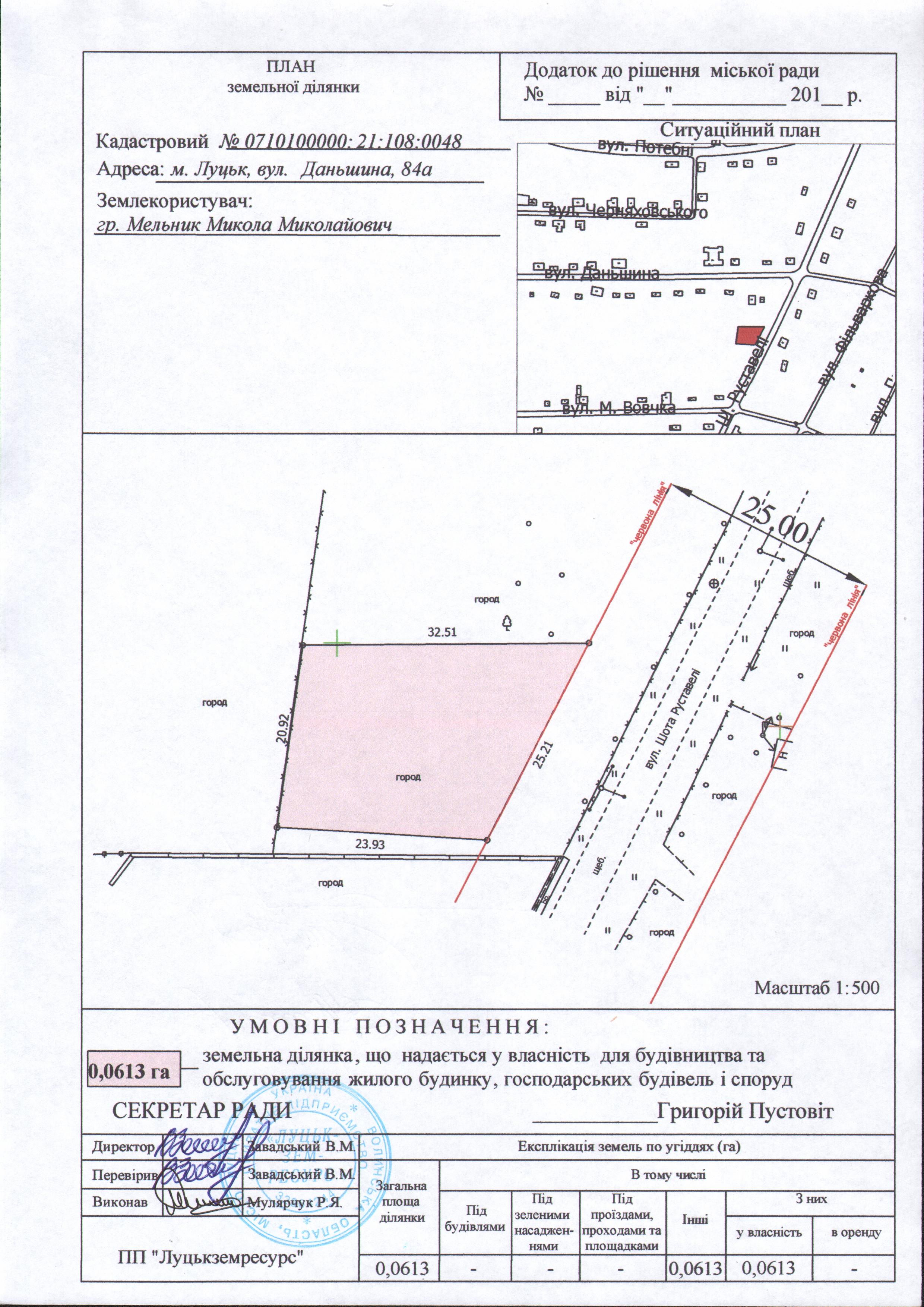 1. Затвердити гр. Мельнику Миколі Миколайовичу проект землеустрою щодо відведення земельної ділянки на вул. Даньшина, 84а площею 0,0613 га для будівництва та обслуговування жилого будинку, господарських будівель і споруд.