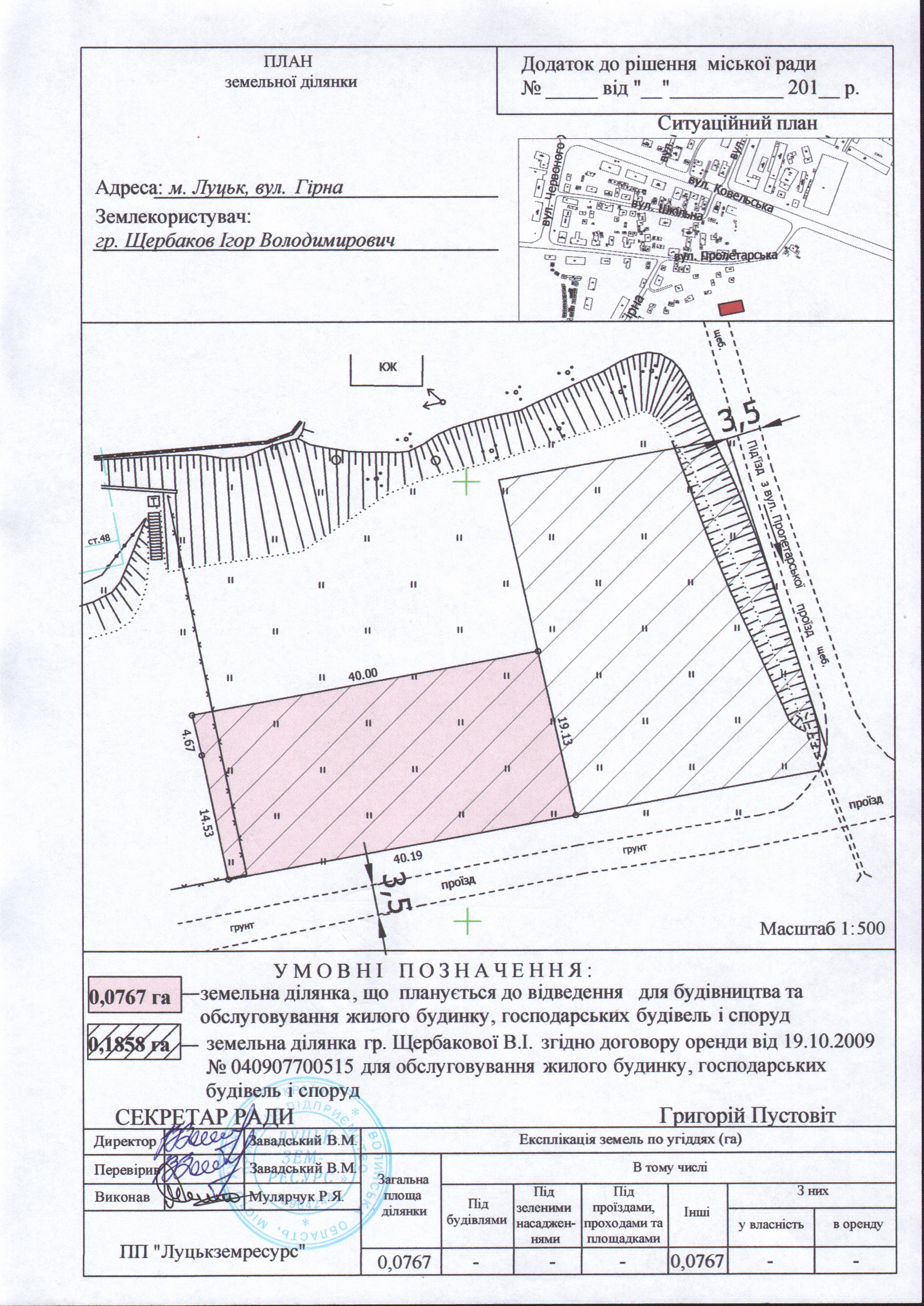 Розглянувши клопотання гр. Щербакова Ігора Володимировича про надання дозволу на розроблення проекту землеустрою щодо відведення земельної ділянки на вул. Гірній для будівництва та обслуговування жилого будинку, господарських будівель і споруд, нотаріальну згоду матері Щербакової Валентини Іванівни на вилучення земельної ділянки площею 0,0767 га, наданої їй в користування на умовах оренди (договір оренди землі, зареєстрований в Державному реєстрі земель від 19.10.2009 за № 040907700515), інформацію Луцької об’єднаної державної податкової інспекції Волинської області ДПС щодо відсутності заборгованості по орендній платі за землю, погоджену схему генплану земельної ділянки, довідку з управління Держкомзему у місті Луцьку Волинської області, керуючись статтями 12, 118, 121-122 Земельного кодексу України, Законом України «Про оренду землі» та ст. 26 Закону України «Про місцеве самоврядування в Україні», міська рада