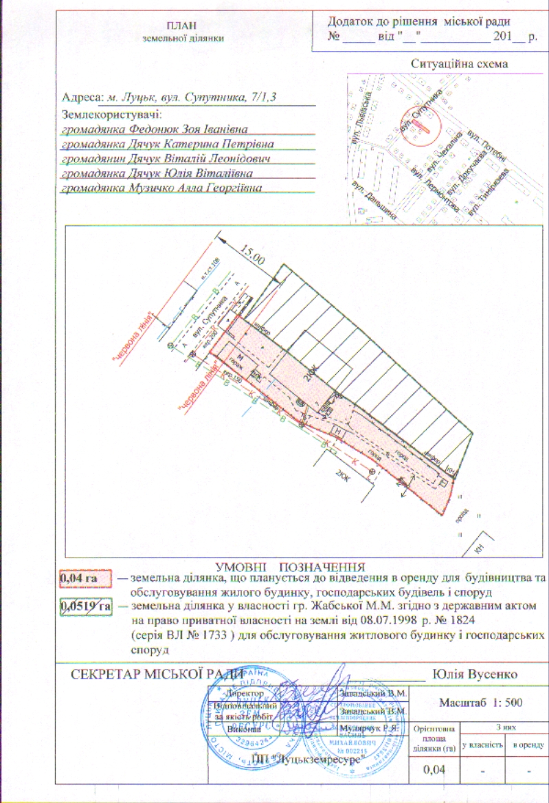 1. Надати громадянам Федонюк Зої Іванівні, Дячук Катерині Петрівні, Дячуку Віталію Леонідовичу, Дячук Юлії Віталіївні, Музичко Аллі Георгіївні дозвіл на розроблення проекту землеустрою щодо відведення земельної ділянки на умовах оренди для будівництва та обслуговування жилого будинку, господарських будівель і споруд на вул. Супутника, 7/1,3, орієнтовною площею 0,04 га, з земель комунальної власності, згідно з додатком.