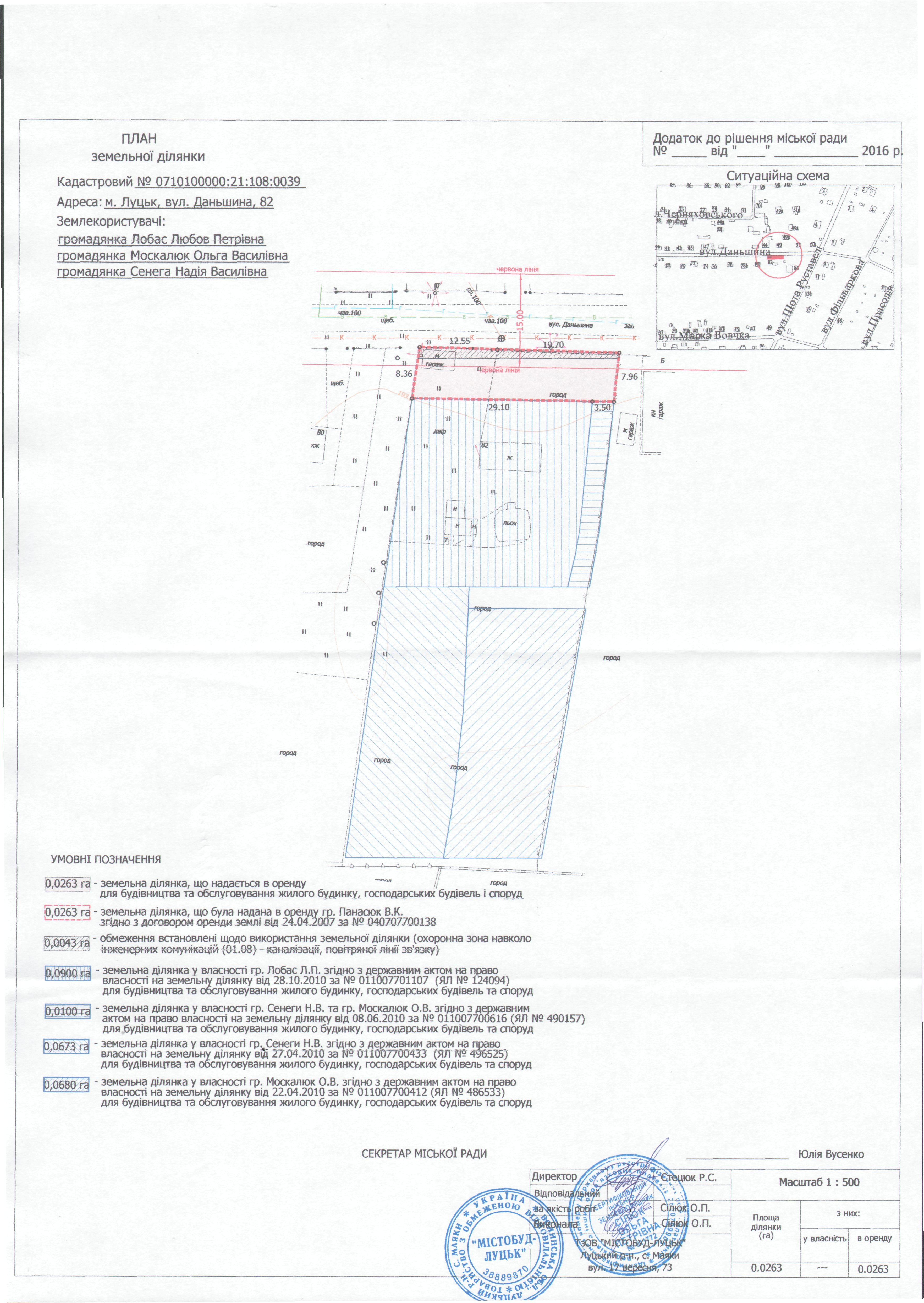 2. Надати громадянам Лобас Любові Петрівні, Москалюк Ользі Василівні, Сенезі Надії Василівні земельну ділянку на вул. Даньшина, 82, на умовах оренди строком на 25 років, площею 0,0263 га, кадастровим номером 0710100000:21:108:0039, для будівництва та обслуговування жилого будинку, господарських будівель і споруд, з земель комунальної власності, згідно з додатком.