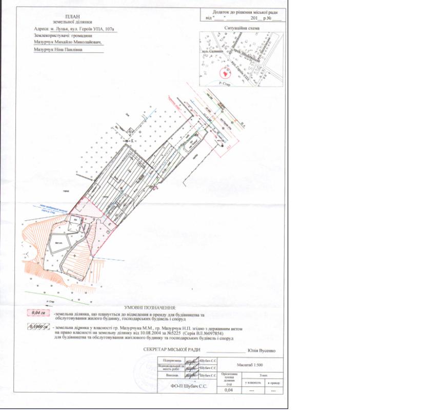 Розглянувши клопотання громадян Мазурчука Михайла Миколайовича, Мазурчук Ніни Павлівни про надання дозволу на розроблення проекту землеустрою щодо відведення земельної ділянки на вул. Героїв УПА, 107а для будівництва та обслуговування жилого будинку, господарських будівель і споруд, схему генплану земельної ділянки з прикладеним листом управління містобудування та архітектури Луцької міської ради щодо режиму забудови даної території, визначеної для містобудівних потреб, встановлених у генеральному плані міста Луцька, враховуючи правовстановлюючі документи на об’єкти нерухомого майна на вул. Героїв УПА, 107а громадян Мазурчука Михайла Миколайовича, Мазурчук Ніни Павлівни: свідоцтво на право особистої власності на жилий будинок від 29.06.1994, відповідно до якого право власності громадянина Мазурчука Михайла Миколайовича зареєстроване 11.07.1994, реєстровий номер 7741, та договір дарування від 30.11.1994 за № 2-5183, відповідно до якого право власності громадянки Мазурчук Ніни Павлівни зареєстроване 20.12.1994, реєстровий номер 7741; державний акт на право власності на земельну ділянку площею 0,1000 га, зареєстрований в Книзі записів реєстрації державних актів на право власності на землю та на право постійного користування землею, договорів оренди землі 10.08.2004 за № 5225, керуючись статтями 12, 79-1, 93, 123 Земельного кодексу України, ст. 6 Закону України «Про оренду землі», ст. 50 Закону України «Про землеустрій», Законом України «Про внесення змін до деяких законодавчих актів України щодо розмежування земель державної та комунальної власності», ст. 26 Закону України “Про місцеве самоврядування в Україні”, Законом України «Про регулювання містобудівної діяльності», п. 107 Постанови Кабінету Міністрів України від 17.10.2012 № 1051 «Про затвердження Порядку ведення Державного земельного кадастру», міська рада