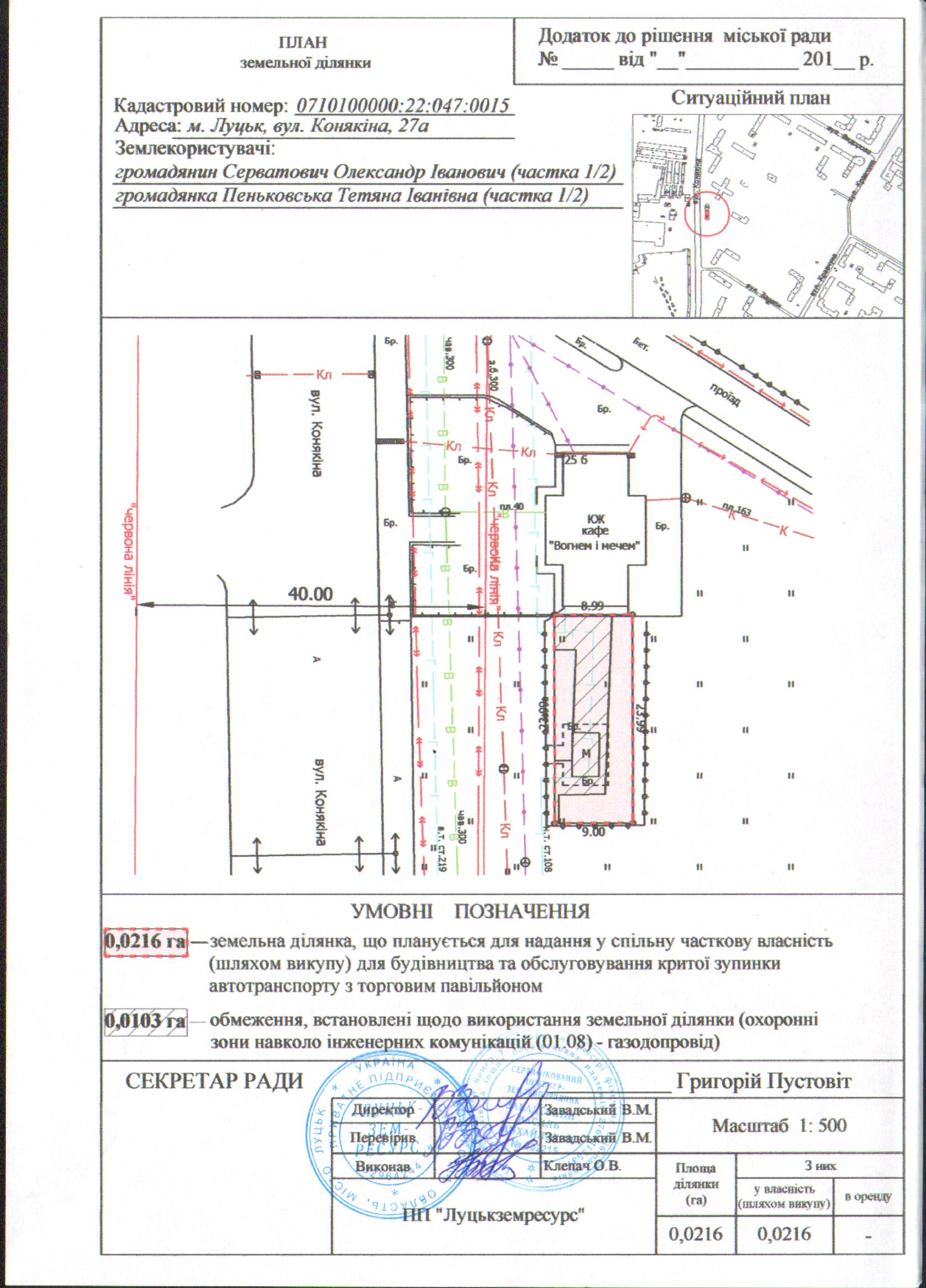 1. Надати громадянам Серватовичу Олександру Івановичу (розмір частки у спільній частковій власності – 1/2), Пеньковській Тетяні Іванівні (розмір частки у спільній частковій власності – 1/2) дозвіл на проведення експертної грошової оцінки земельної ділянки на вул. Конякіна, 27а, площею 0,0216 га, кадастровим номером 0710100000:22:047:0015, для будівництва та обслуговування критої зупинки автотранспорту з торговим павільйоном, згідно з додатком.