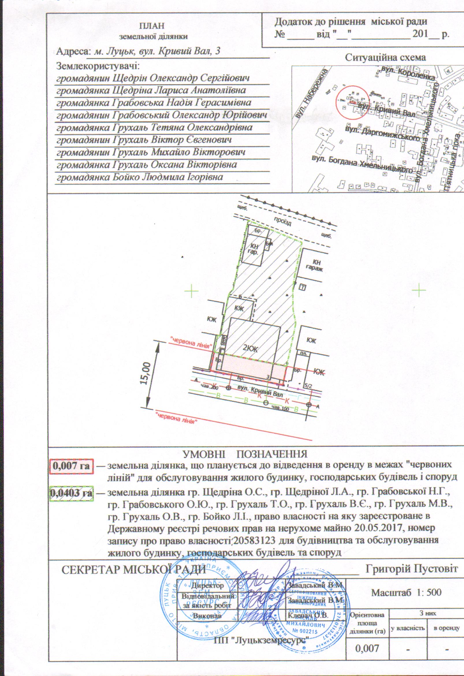 Розглянувши клопотання громадян Щедріна Олександра Сергійовича, Щедріної Лариси Анатоліївни, Грабовської Надії Герасимівни, Грабовського Олександра Юрійовича, Грухаль Тетяни Олександрівни, Грухаля Віктора Євгеновича, Грухаля Михайла Вікторовича, Грухаль Оксани Вікторівни, Бойко Людмили Ігорівни про надання дозволу на розроблення проекту землеустрою щодо відведення земельної ділянки на вул. Кривий Вал, 3 в межах «червоних ліній» для обслуговування жилого будинку, господарських будівель і споруд, схему генплану земельної ділянки з прикладеним листом управління містобудування та архітектури Луцької міської ради щодо режиму забудови даної території, визначеної для містобудівних потреб, встановлених у генеральному плані міста Луцька, враховуючи правовстановлюючі документи на об’єкти нерухомого майна громадян Щедріна Олександра Сергійовича, Щедріної Лариси Анатоліївни, Грабовської Надії Герасимівни, Грабовського Олександра Юрійовича, Грухаль Тетяни Олександрівни, Грухаля Віктора Євгеновича, Грухаля Михайла Вікторовича, Грухаль Оксани Вікторівни, Бойко Людмили Ігорівни на вул. Кривий Вал, 3: рішення Луцького міськрайонного суду Волинської області від 11.12.2015, справа № 161/12321/15-ц, відповідно до якого право власності громадян Щедріна Олександра Сергійовича, Щедріної Лариси Анатоліївни по 1/2 частин квартири № 1 житлового будинку № 3 зареєстроване в Державному реєстрі речових прав на нерухоме майно 12.02.2016, номер запису про право власності: 13598973; технічний паспорт на квартиру № 1 у житловому будинку № 3 від 2015; свідоцтво про право на спадщину за законом від 25.05.1999 за № 4-335, відповідно до якого право власності громадянки Щедріної Лариси Анатоліївни на квартиру № 2 у житловому будинку № 3 зареєстроване 25.10.2007, реєстраційний номер: 20781934, технічний паспорт на квартиру № 2 у житловому будинку № 3 від 25.10.2007; свідоцтво про право власності на житло від 09.08.2007 № 776-р, відповідно до якого право спільної сумісної власності громадян Грабовської Надії Герасимівни, Грабовського Олександра Юрійовича на квартиру № 3 у житловому будинку № 3 зареєстроване 18.08.2007, реєстраційний номер: 19973337, технічний паспорт на квартиру № 3 у житловому будинку № 3 від 2006; свідоцтво про право власності на житло від 08.09.2005 № 692-р, відповідно до якого право спільної сумісної власності громадян Грухаль Тетяни Олександрівни, Грухаля Віктора Євгеновича, Грухаля Михайла Вікторовича, Грухаль Оксани Вікторівни на квартиру № 4 у житловому будинку № 3 зареєстроване 16.09.2005, реєстраційний номер: 12093142, технічний паспорт на квартиру № 4 у житловому будинку № 3 від 2005; свідоцтво про право на спадщину за заповітом від 25.08.2005 за № 3-1178, відповідно до якого право власності громадянки Бойко Людмили Ігорівни на квартиру № 5 у житловому будинку № 3 зареєстроване 08.09.2005, реєстраційний номер: 11368665, технічний паспорт на квартиру № 5 у житловому будинку № 3 від 07.09.2005; рішення Луцької міської ради від 21.03.2017 № 20/50 «Про передачу громадянам Щедріну О.С., Щедріній Л.А., Грабовській Н.Г., Грабовському О.Ю., Грухаль Т.О., Грухалю В.Є., Грухалю М.В., Грухаль О.В., Бойко Л.І. безоплатно у спільну сумісну власність земельної ділянки для будівництва та обслуговування жилого будинку, господарських будівель і споруд на вул. Кривий Вал, 3», відповідно до якого право спільної сумісної власності громадян Щедріна Ол