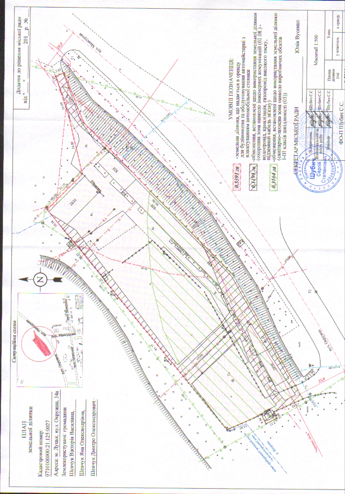 2. Надати громадянам Шевчук Вікторії Василівні, Шевчук Яні Олександрівні, Шевчуку Дмитру Олександровичу земельну ділянку на вул. Окружній, 34а на умовах оренди строком на 10 років, площею 0,5391 га, кадастровим номером 0710100000:21:125:0027, для будівництва та обслуговування автомайстерні з влаштуванням автомобільної стоянки, згідно з додатком.
