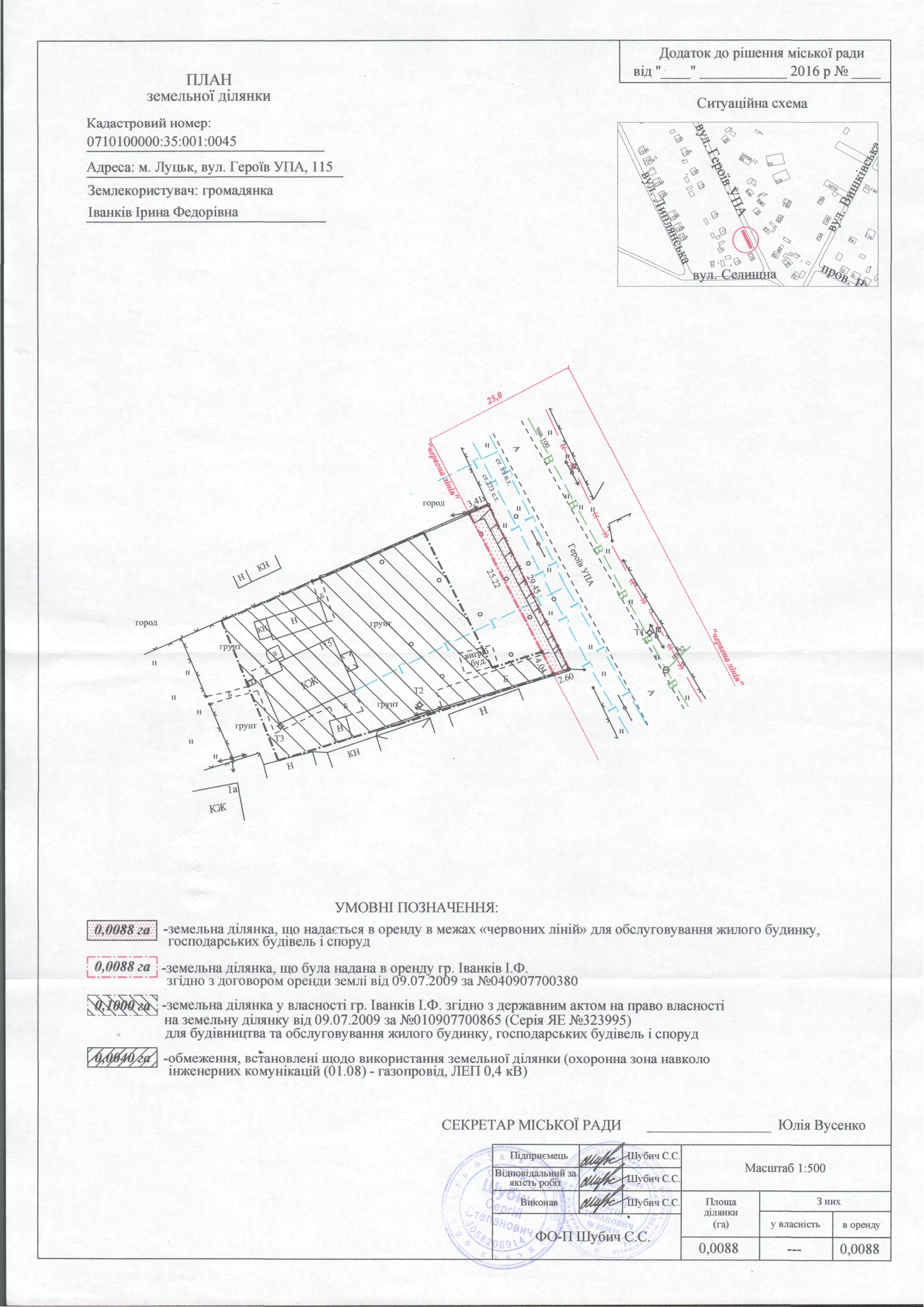 2. Надати громадянці Іванків Ірині Федорівні земельну ділянку на вул. Героїв УПА, 115, на умовах оренди строком на 25 років, площею 0,0088 га, кадастровим номером 0710100000:35:001:0045, в межах «червоних ліній» для обслуговування жилого будинку, господарських будівель і споруд, з земель комунальної власності, згідно з додатком.