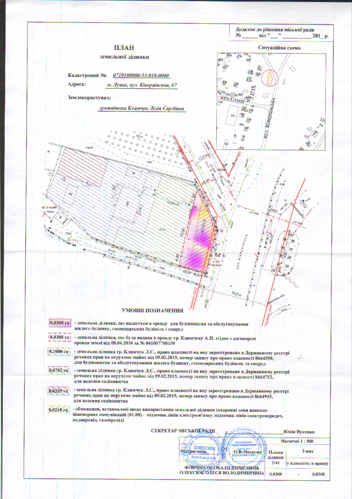 3. Укласти з громадянкою Климчук Лілією Сергіївною договір оренди земельної ділянки на вул. Ківерцівській, 67 на вказаних в даному рішенні умовах, а також оформити інші документи, необхідні для вчинення цієї угоди.