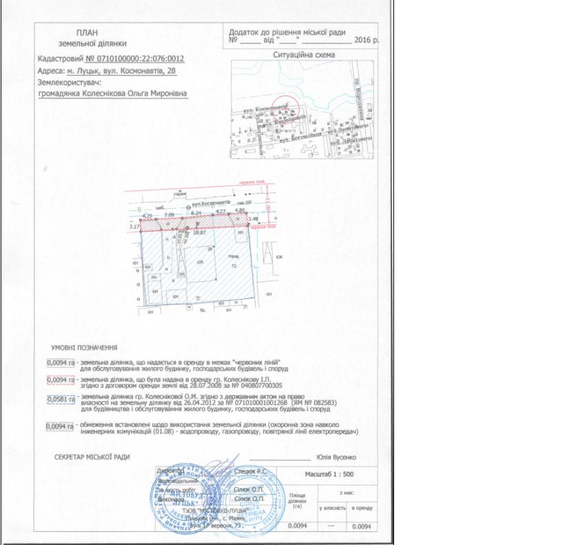 2. Надати громадянці Колесніковій Ользі Миронівні земельну ділянку на вул. Космонавтів, 28, на умовах оренди строком на 25 років, площею 0,0094 га, кадастровим номером 0710100000:22:076:0012, в межах «червоних ліній» для обслуговування жилого будинку, господарських будівель і споруд, з земель комунальної власності, згідно з додатком.
