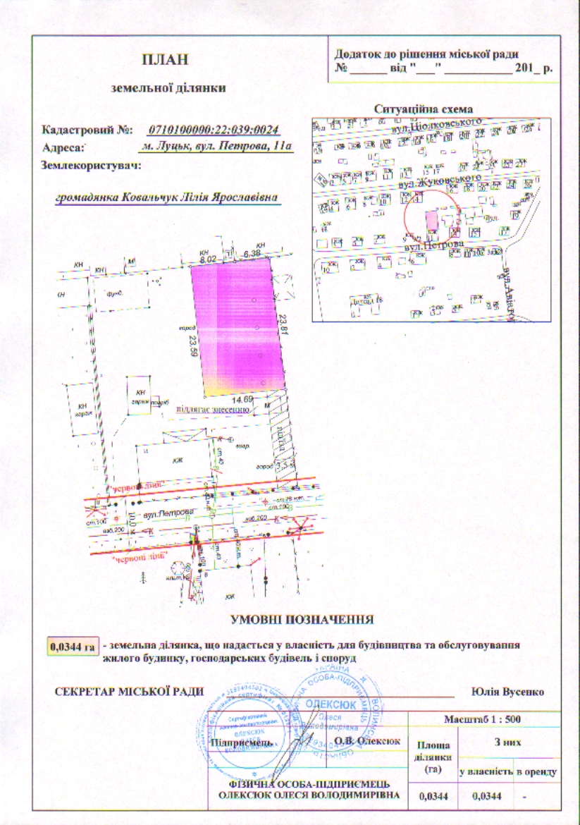 2. Надати громадянці Ковальчук Лілії Ярославівні у власність земельну ділянку на вул. Петрова, 11а площею 0,0344 га, кадастровим номером 0710100000:22:039:0024 для будівництва та обслуговування жилого будинку, господарських будівель і споруд, згідно з додатком.