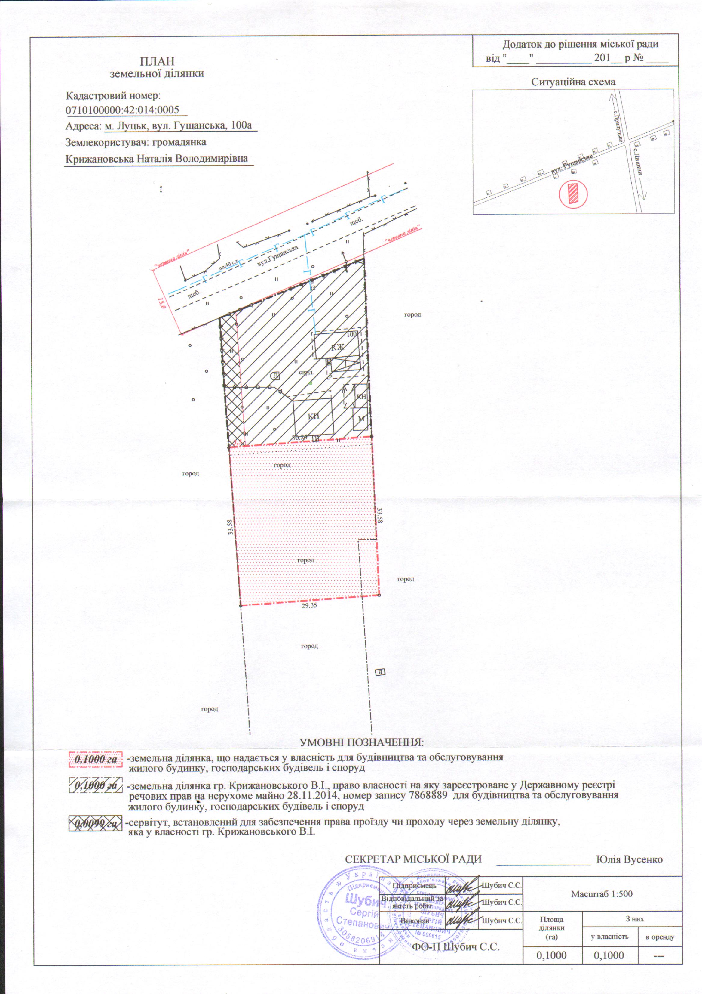 2. Надати громадянці Крижановській Наталії Володимирівні у власність земельну ділянку на вул. Гущанській, 100а площею 0,1000 га, кадастровим номером 0710100000:42:014:0005 для будівництва та обслуговування жилого будинку, господарських будівель і споруд, згідно з додатком.