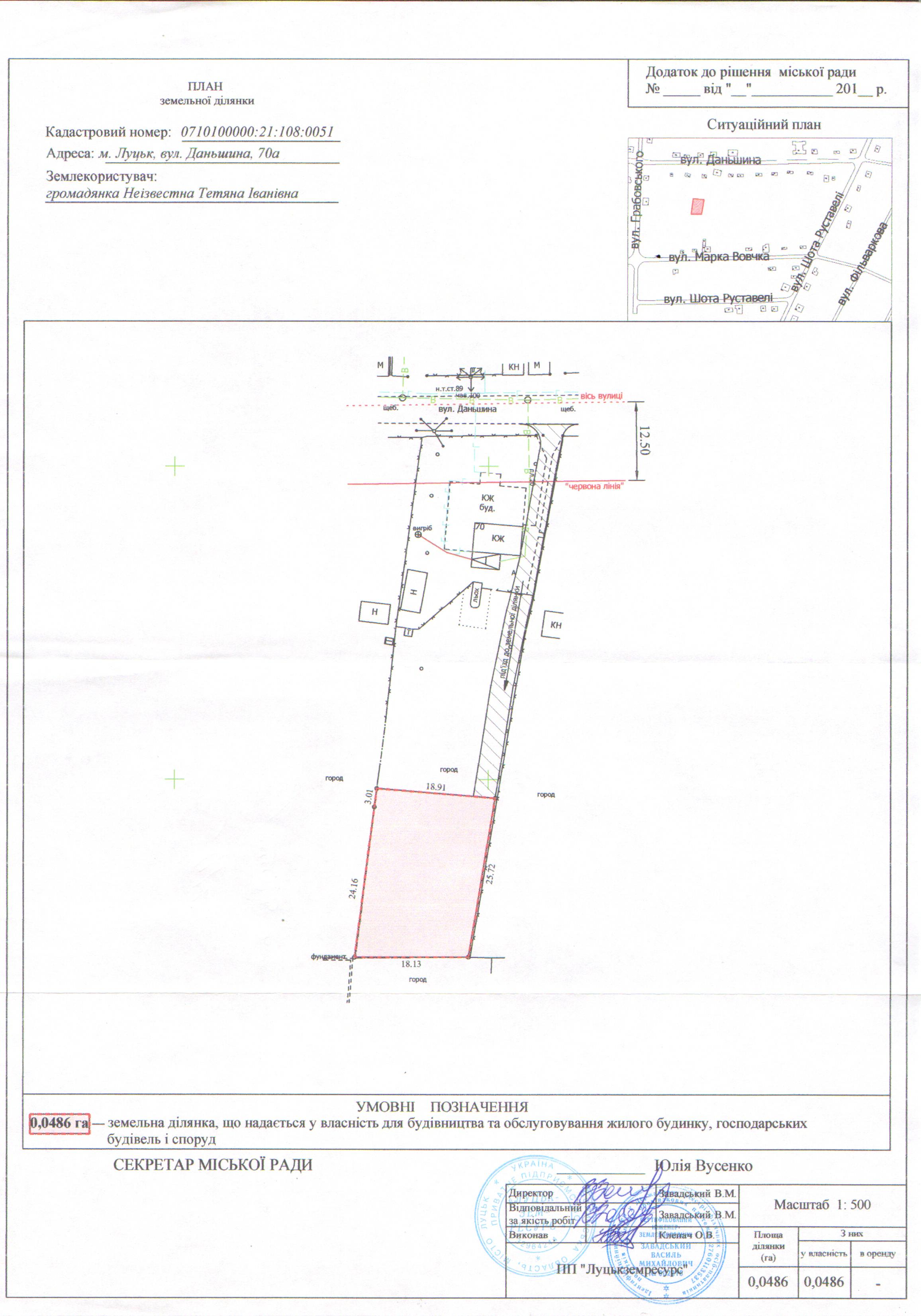 2. Надати громадянці Неізвестній Тетяні Іванівні у власність земельну ділянку на вул. Даньшина, 70а площею 0,0486 га, кадастровим номером 0710100000:21:108:0051 для будівництва та обслуговування жилого будинку, господарських будівель і споруд, згідно з додатком.