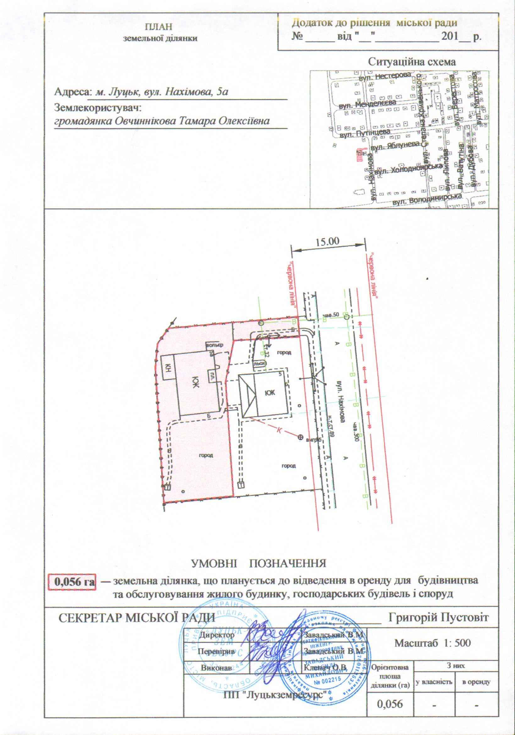 Розглянувши клопотання громадянки Овчиннікової Тамари Олексіївни (громадянка Латвійської Республіки) про надання дозволу на розроблення проекту землеустрою щодо відведення земельної ділянки на вул. Нахімова, 5а для будівництва та обслуговування жилого будинку, господарських будівель і споруд, схему генплану земельної ділянки з прикладеним листом управління містобудування та архітектури Луцької міської ради щодо режиму забудови даної території, визначеної для містобудівних потреб, встановлених у генеральному плані міста Луцька, враховуючи правовстановлюючі документи на об’єкти нерухомого майна на вул. Нахімова, 5а громадянки Овчиннікової Тамари Олексіївни: свідоцтво про право на спадщину за законом від 30.04.1996 за № 4-1845, договір розподілу спадкового майна від 30.04.1996 за № 4-1847, відповідно до яких право власності на житловий будинок зареєстроване 11.06.2009, реєстраційний номер: 27518648, технічний паспорт на об’єкт нерухомого майна від 10.06.2009, керуючись статтями 12, 79-1, 93, 96, 123 Земельного кодексу України, статтею 6 Закону України «Про оренду землі», статтею 50 Закону України «Про землеустрій», Законом України «Про регулювання містобудівної діяльності», Законом України «Про внесення змін до деяких законодавчих актів України щодо розмежування земель державної та комунальної власності», статтею 26 Закону України «Про місцеве самоврядування в Україні», міська рада