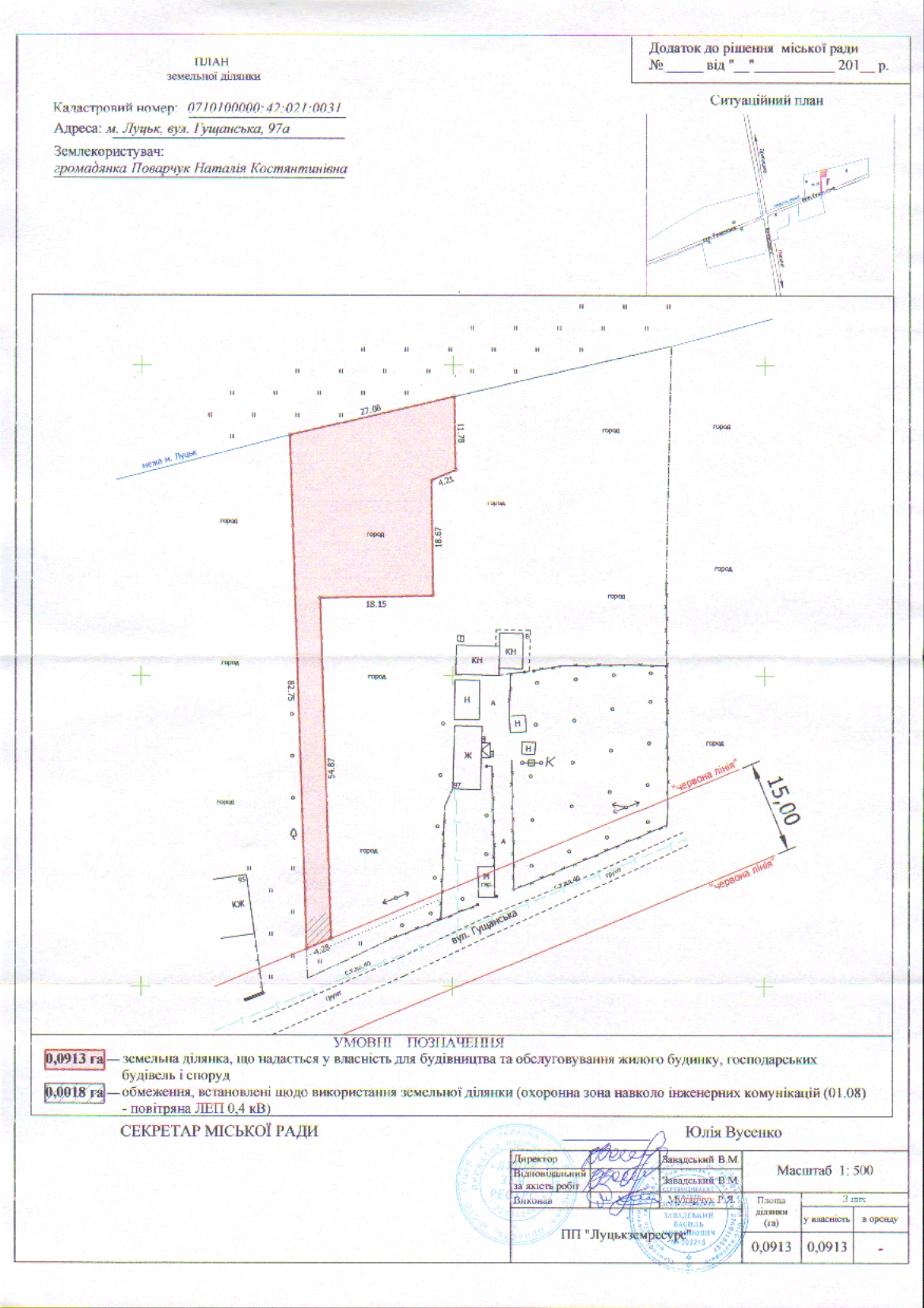 2. Надати громадянці Поварчук Наталії Костянтинівні у власність земельну ділянку на вул. Гущанській, 97 а площею 0,0913 га, кадастровим номером 0710100000:42:021:0031 для будівництва та обслуговування жилого будинку, господарських будівель і споруд, згідно з додатком.