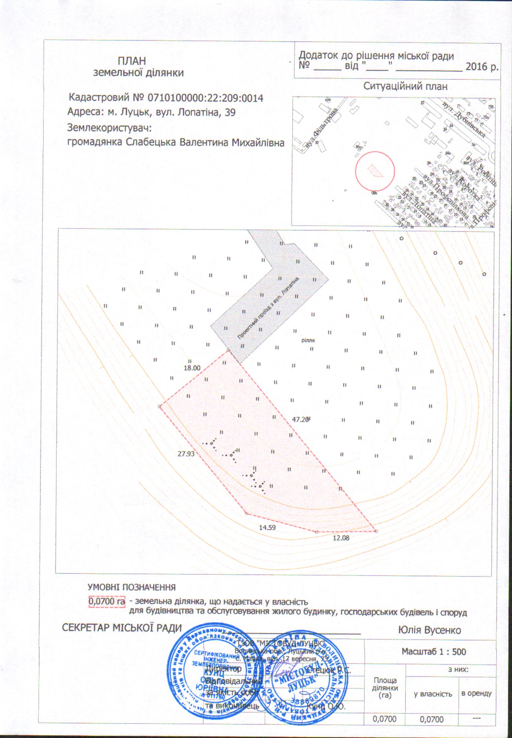 2. Надати громадянці Слабецькій Валентині Михайлівні у власність земельну ділянку на вул. Лопатіна, 39 площею 0,0700 га, кадастровим номером 0710100000:22:209:0014 для будівництва та обслуговування жилого будинку, господарських будівель і споруд, згідно з додатком.