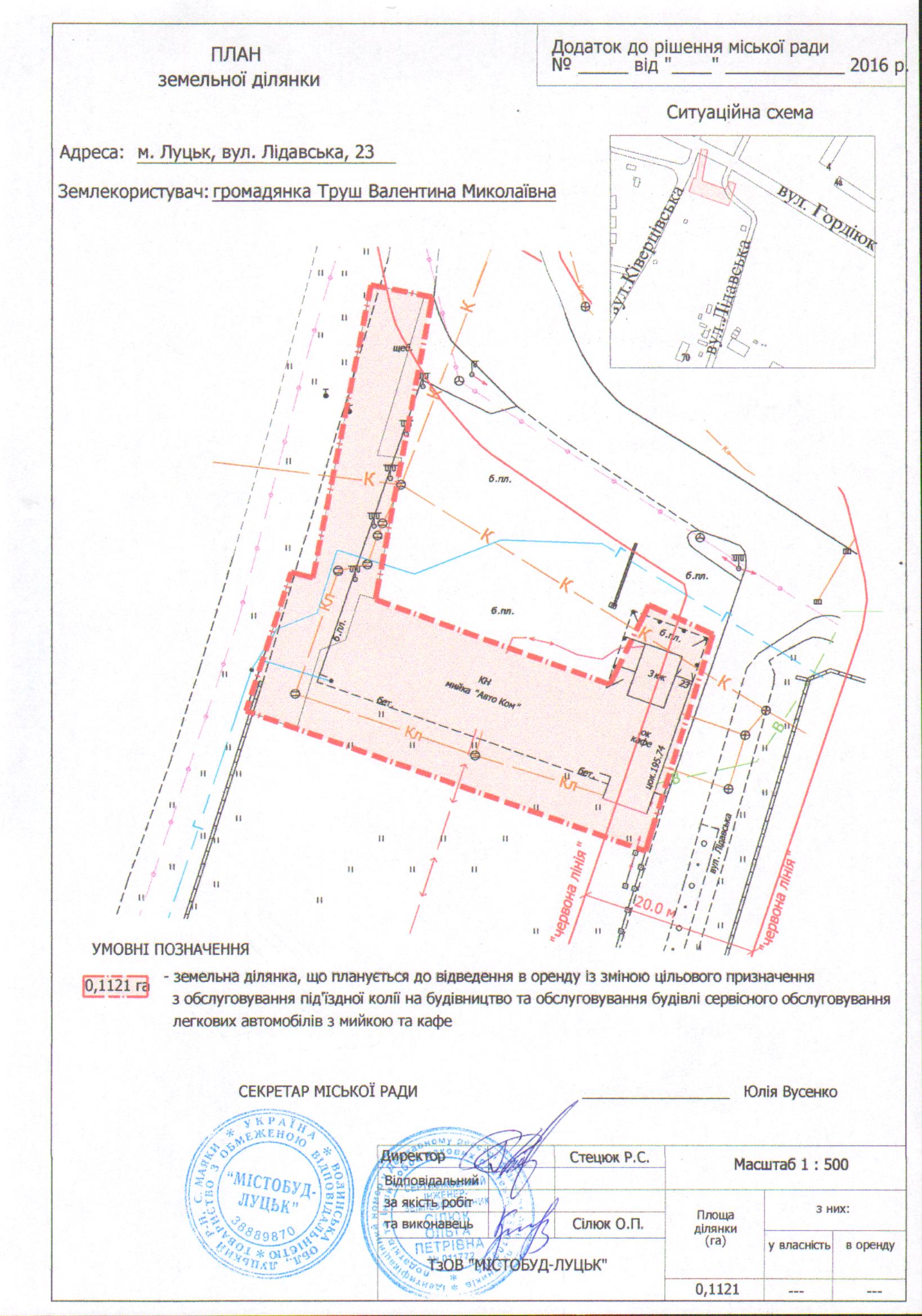 1. Надати громадянці Труш Валентині Миколаївні дозвіл на розроблення проекту землеустрою щодо відведення земельної ділянки на умовах оренди на вул. Лідавській, 23, площею 0,1121 га, кадастровим номером 0710100000:22:034:0028, із зміною цільового призначення з обслуговування під'їздної колії на будівництво та обслуговування будівлі сервісного обслуговування легкових автомобілів з мийкою та кафе, з земель комунальної власності, згідно з додатком.