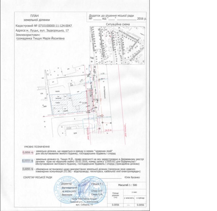 1. Затвердити громадянці Тищук Марії Йосипівні проект землеустрою щодо відведення земельної ділянки на вул. Задворецькій, 17, площею 0,0056 га, кадастровим номером 0710100000:11:124:0047, в межах «червоних ліній» для обслуговування жилого будинку, господарських будівель і споруд.