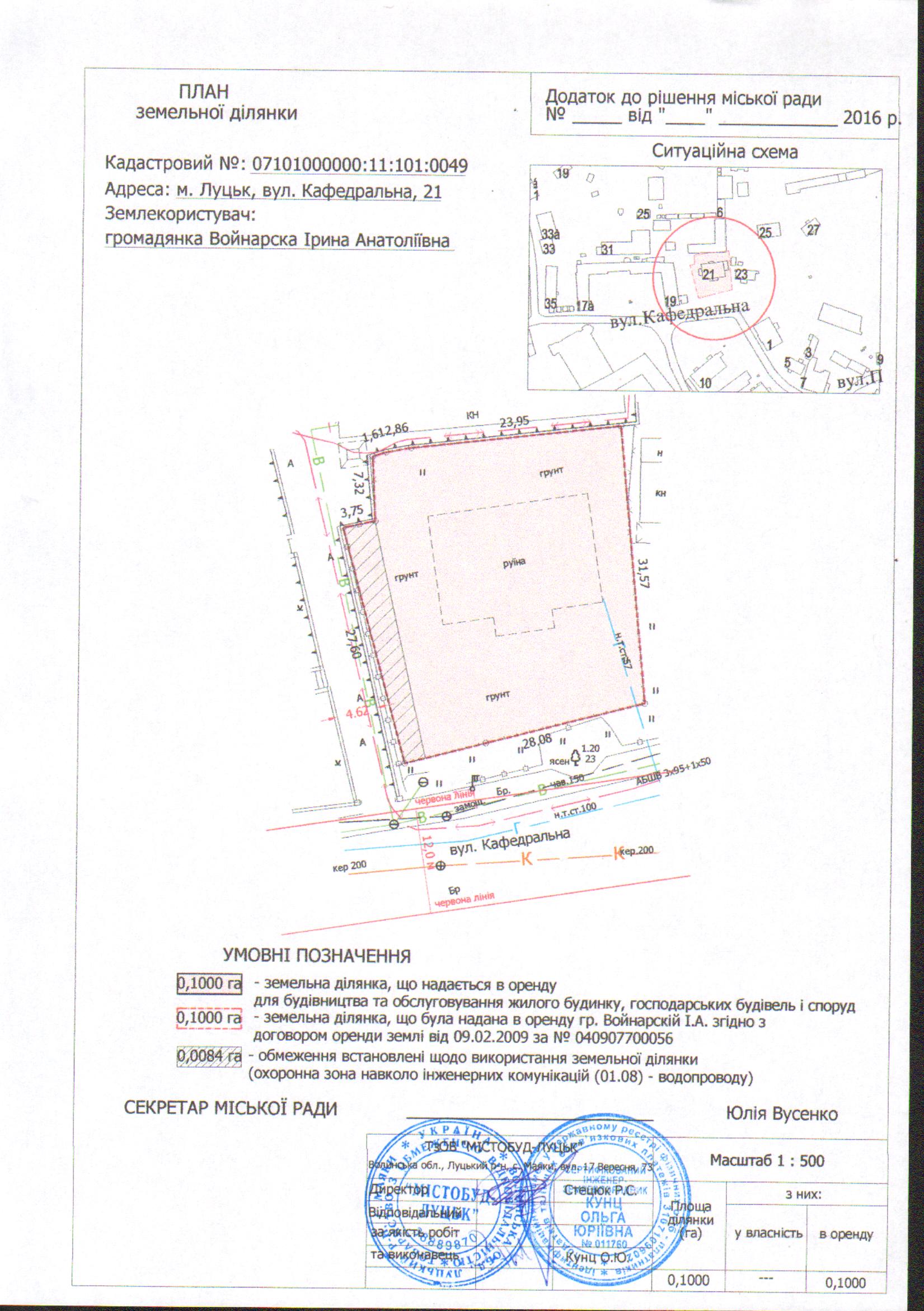 3. Надати громадянці Войнарскій Ірині Анатоліївні земельну ділянку на вул. Кафедральній, 21, на умовах оренди строком на 25 років, площею 0,1000 га, кадастровим номером 0710100000:11:101:0049, для будівництва та обслуговування жилого будинку, господарських будівель і споруд, з земель комунальної власності, згідно з додатком.