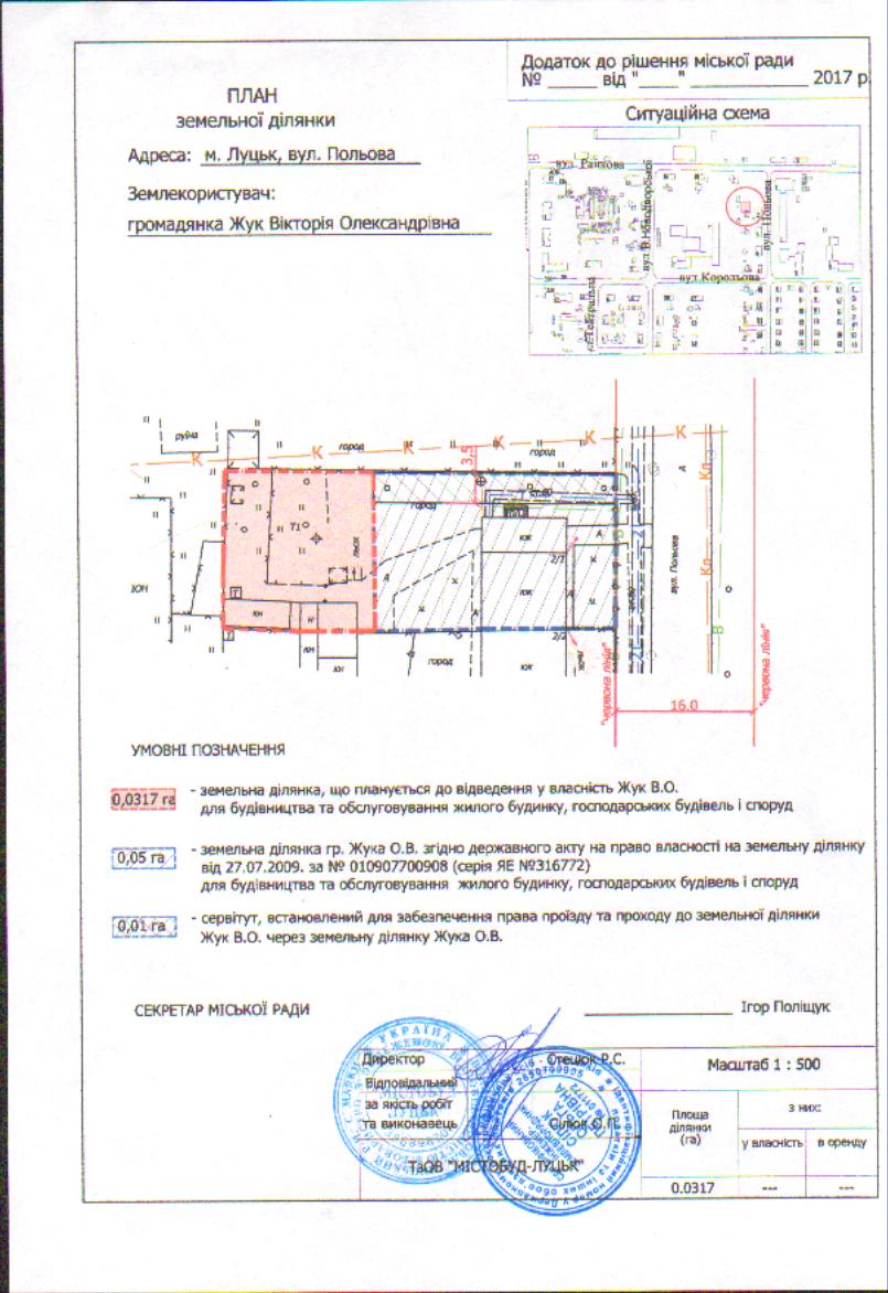 1. Надати громадянці Жук Вікторії Олександрівні дозвіл на розроблення проекту землеустрою щодо відведення земельної ділянки у власність для будівництва та обслуговування жилого будинку, господарських будівель і споруд на вул. Польовій, орієнтовною площею 0,0317 га, згідно з додатком. Проект землеустрою щодо відведення земельної ділянки подати для розгляду та затвердження у встановленому порядку.