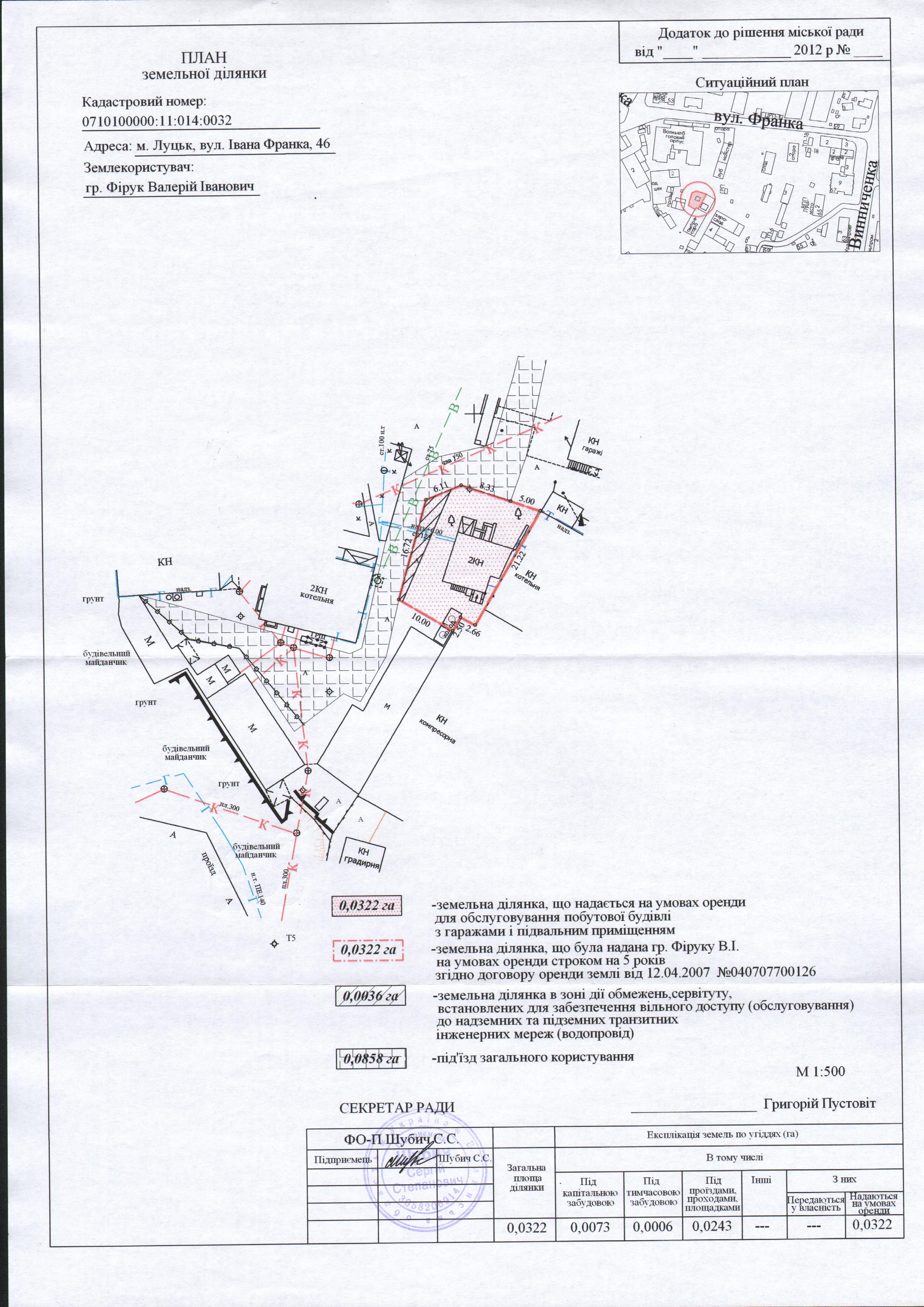 1. Надати громадянину Фіруку Валерію Івановичу на умовах оренди строком на 5 років земельну ділянку на вул. Івана Франка, 46 площею 0,0322 га для обслуговування побутової будівлі з гаражами і підвальним приміщенням за рахунок земель міста, не наданих у власність чи користування, згідно з додатком.