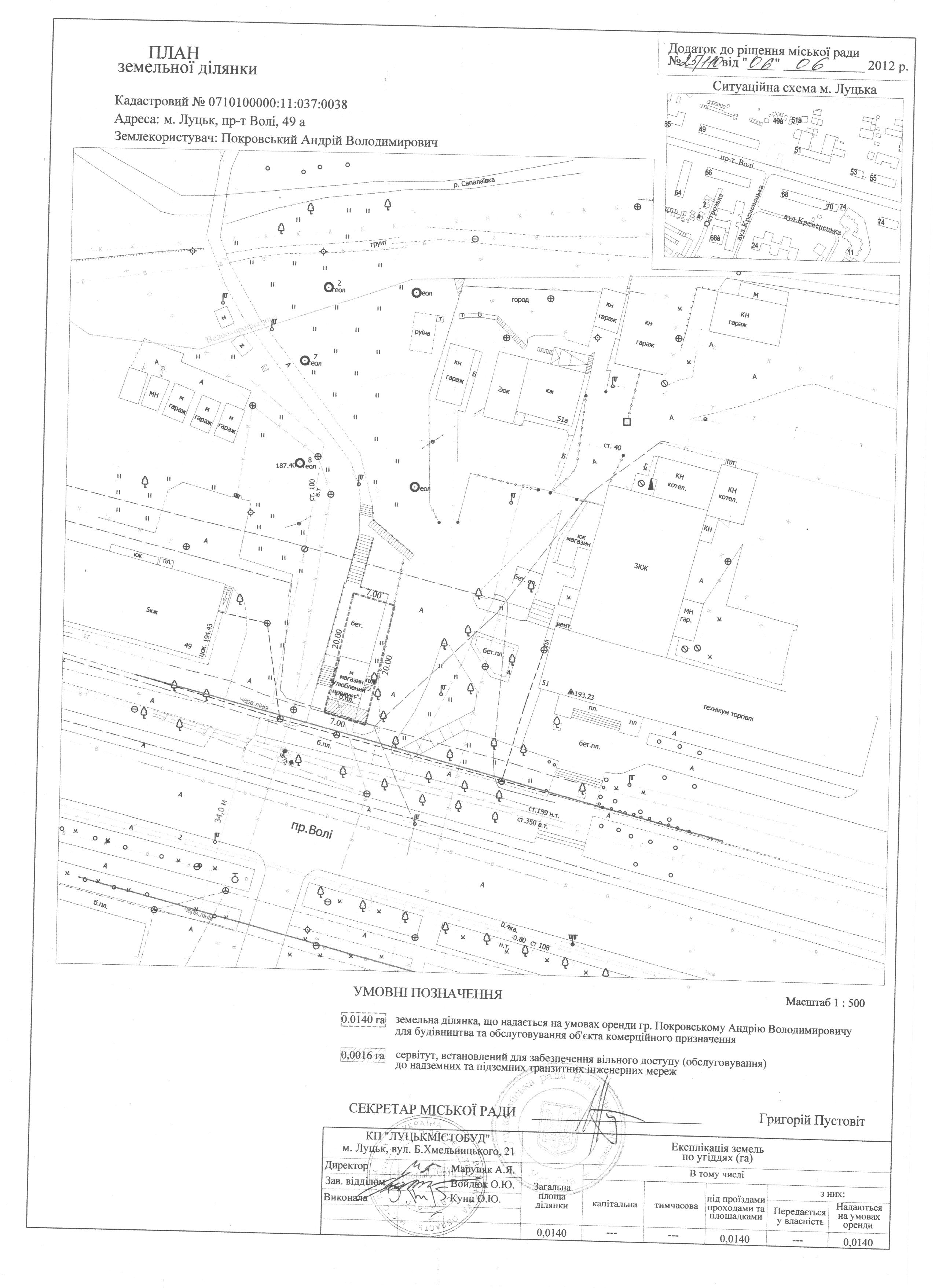 1. Затвердити громадянину Покровському Андрію Володимировичу проект землеустрою щодо відведення земельної ділянки на пр-ті Волі, 49а площею 0,0140 га для будівництва та обслуговування об’єкта комерційного призначення.