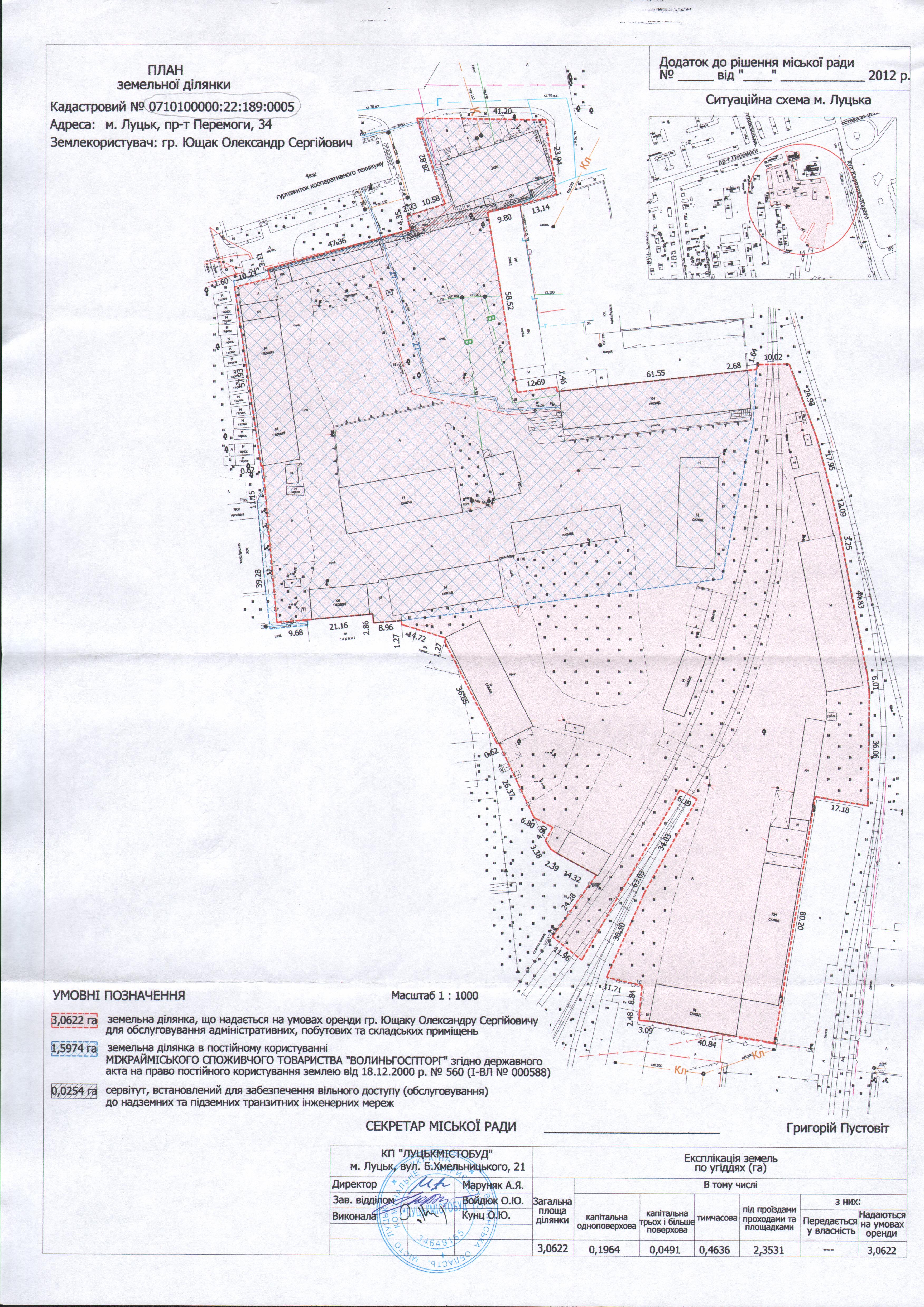 3. Надати громадянину Ющаку Олександру Сергійовичу на умовах оренди строком на 5 років земельну ділянку на пр-ті Перемоги, 34 площею 3,0622 га для обслуговування адміністративних, побутових та складських приміщень, за рахунок земель Міжрайміського споживчого товариства «Волиньгоспторг», наданих в постійне користування (площею 1,5974 га) та земель міста, не наданих у власність чи користування (площею 1,4648 га), згідно з додатком.