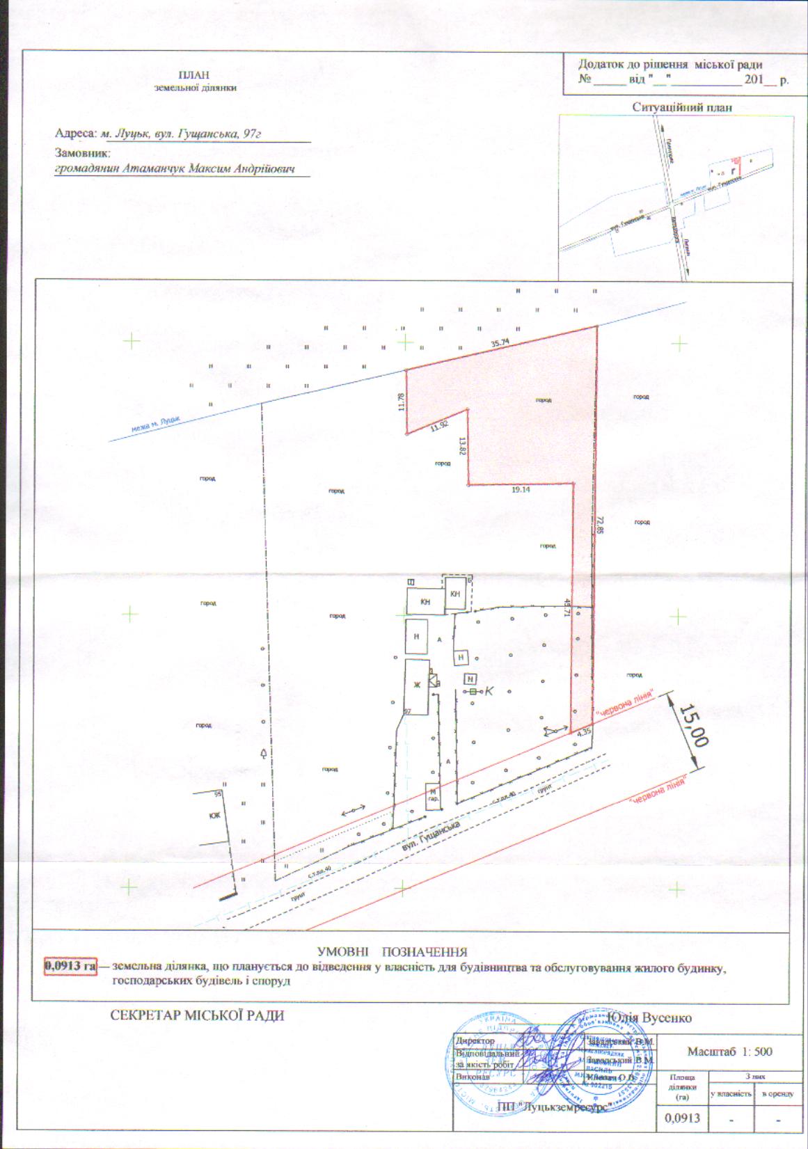 1. Надати громадянину Атаманчуку Максиму Андрійовичу дозвіл на розроблення проекту землеустрою щодо відведення земельної ділянки у власність для будівництва та обслуговування жилого будинку, господарських будівель і споруд на вул. Гущанській, площею 0,0913 га, згідно з додатком. Проект землеустрою щодо відведення земельної ділянки подати для розгляду та затвердження у встановленому порядку.