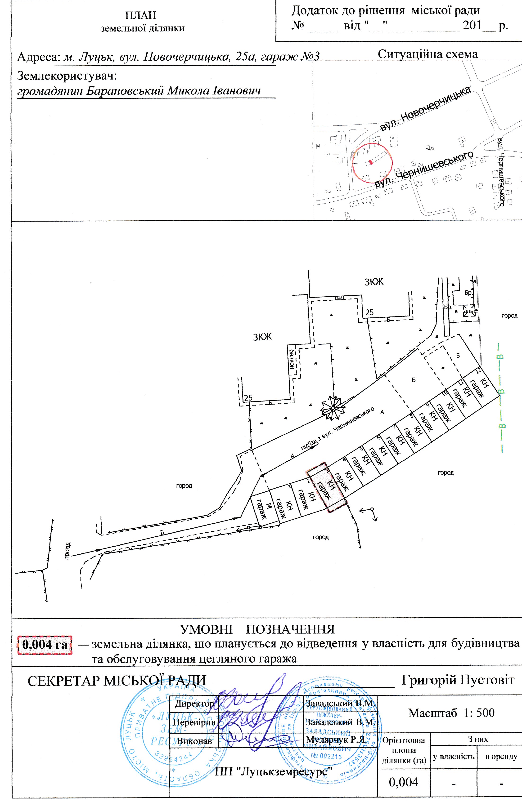 1. Надати громадянину Барановському Миколі Івановичу дозвіл на розроблення проекту землеустрою щодо відведення земельної ділянки у власність для будівництва та обслуговування цегляного гаража на вул. Новочерчицькій, 25а, гараж №3, орієнтовною площею 0,004 га, згідно з додатком. Проект землеустрою щодо відведення земельної ділянки подати для розгляду та затвердження у встановленому порядку.