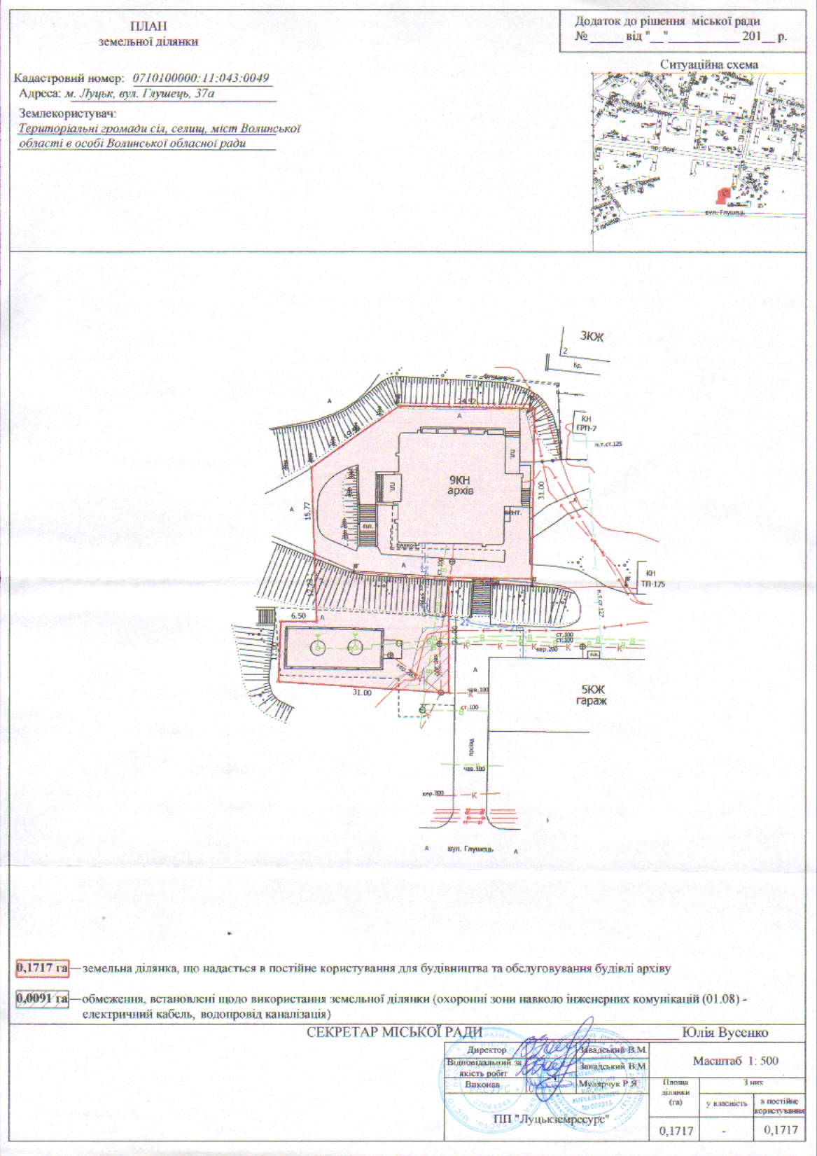 1. Затвердити територіальним громадам сіл, селищ, міст Волинської області в особі Волинської обласної ради проект землеустрою щодо відведення земельної ділянки на вул. Глушець, 37а в м. Луцьку площею 0,1717 га, кадастровим номером 0710100000:11:043:0049 для будівництва та обслуговування будівлі архіву, згідно з додатком.