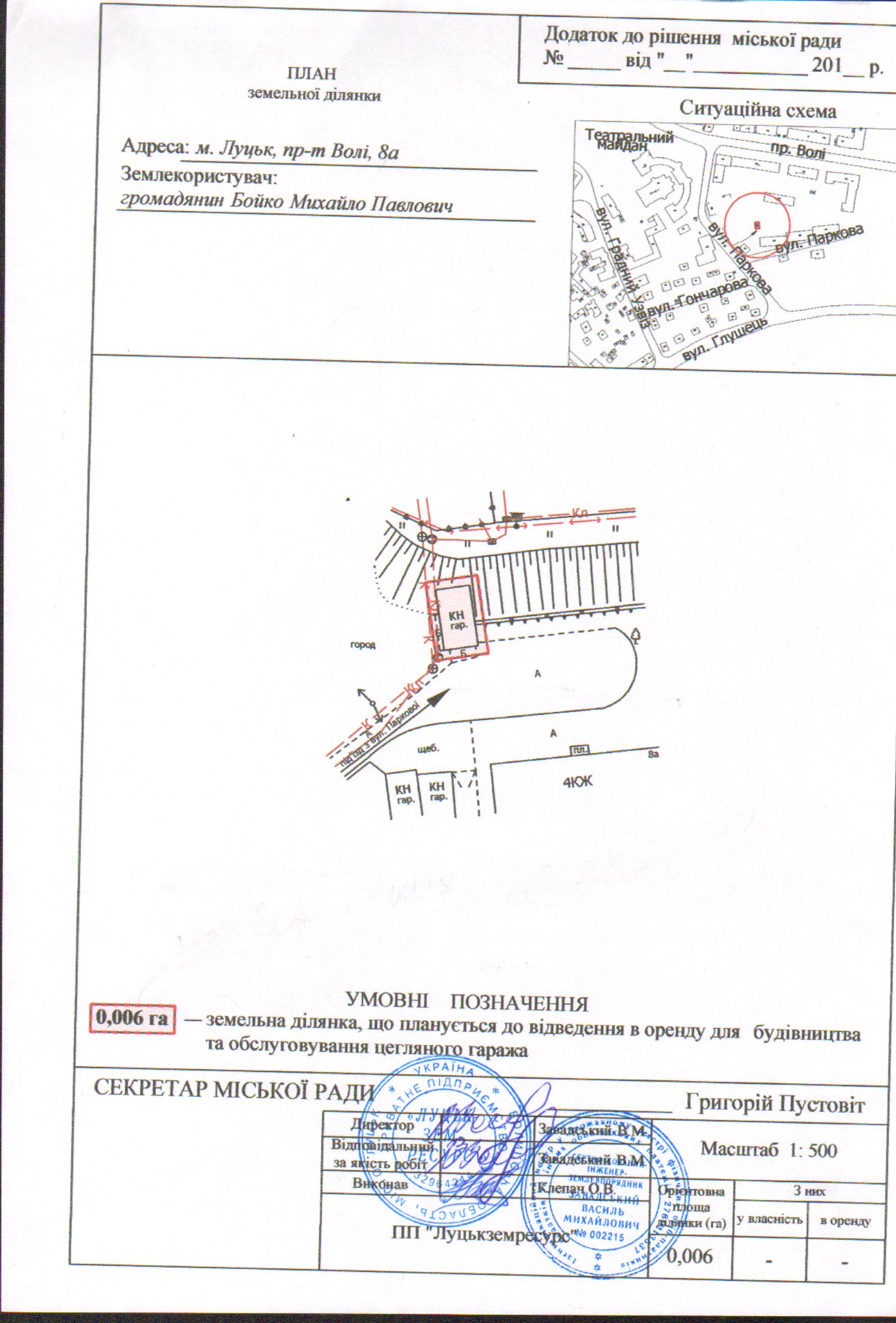 Розглянувши клопотання громадянина Бойка Михайла Павловича про надання дозволу на розроблення проекту землеустрою щодо відведення земельної ділянки на пр-ті Волі, 8а для будівництва та обслуговування цегляного гаража, схему генплану земельної ділянки з прикладеним листом управління містобудування та архітектури Луцької міської ради щодо режиму забудови даної території, визначеної для містобудівних потреб, встановлених у генеральному плані міста Луцька, враховуючи рішення виконавчого комітету Луцької міської ради від 31.01.2004 № 31 «Про внесення змін в пункт 1 розпорядження від 17.07.1998 № 354-рв «Про дозвіл на встановлення гаража»», вихідні дані на проектування, видані управлінням містобудування та архітектури Луцької міської ради 16.04.2004, реєстраційний № 62-8а/04, керуючись статтями 12, 79-1, 93, 123 Земельного кодексу України, статтею 6 Закону України «Про оренду землі», ст. 50 Закону України «Про землеустрій», Законом України «Про внесення змін до деяких законодавчих актів України щодо розмежування земель державної та комунальної власності», ст. 26 Закону України “Про місцеве самоврядування в Україні”, Законом України «Про регулювання містобудівної діяльності», міська рада