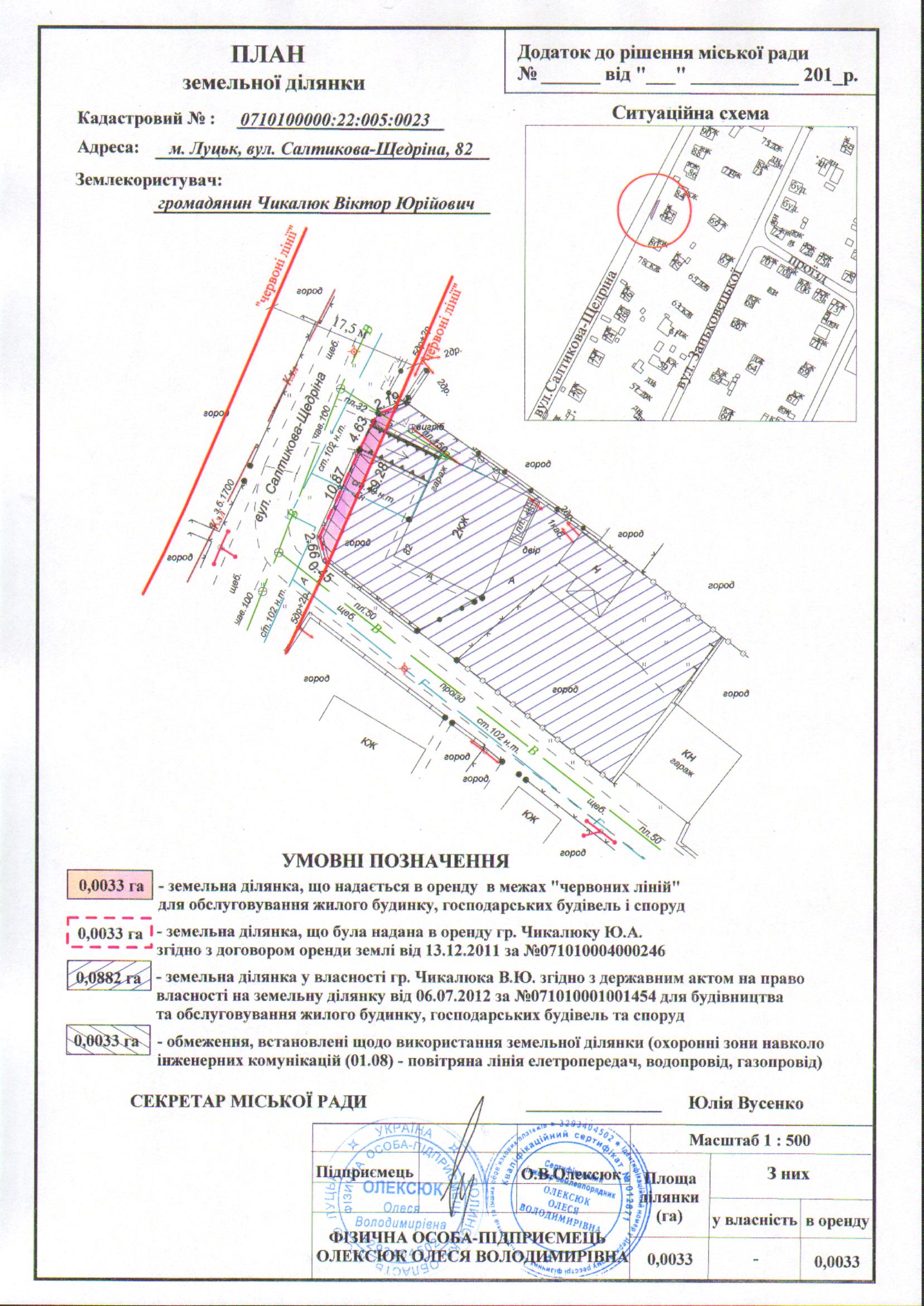 2. Надати громадянину Чикалюку Віктору Юрійовичу земельну ділянку на вул. Салтикова-Щедріна, 82, на умовах оренди строком на 25 років, площею 0,0033 га, кадастровим номером 0710100000:22:005:0023, в межах «червоних ліній» для обслуговування жилого будинку, господарських будівель і споруд, з земель комунальної власності, згідно з додатком.