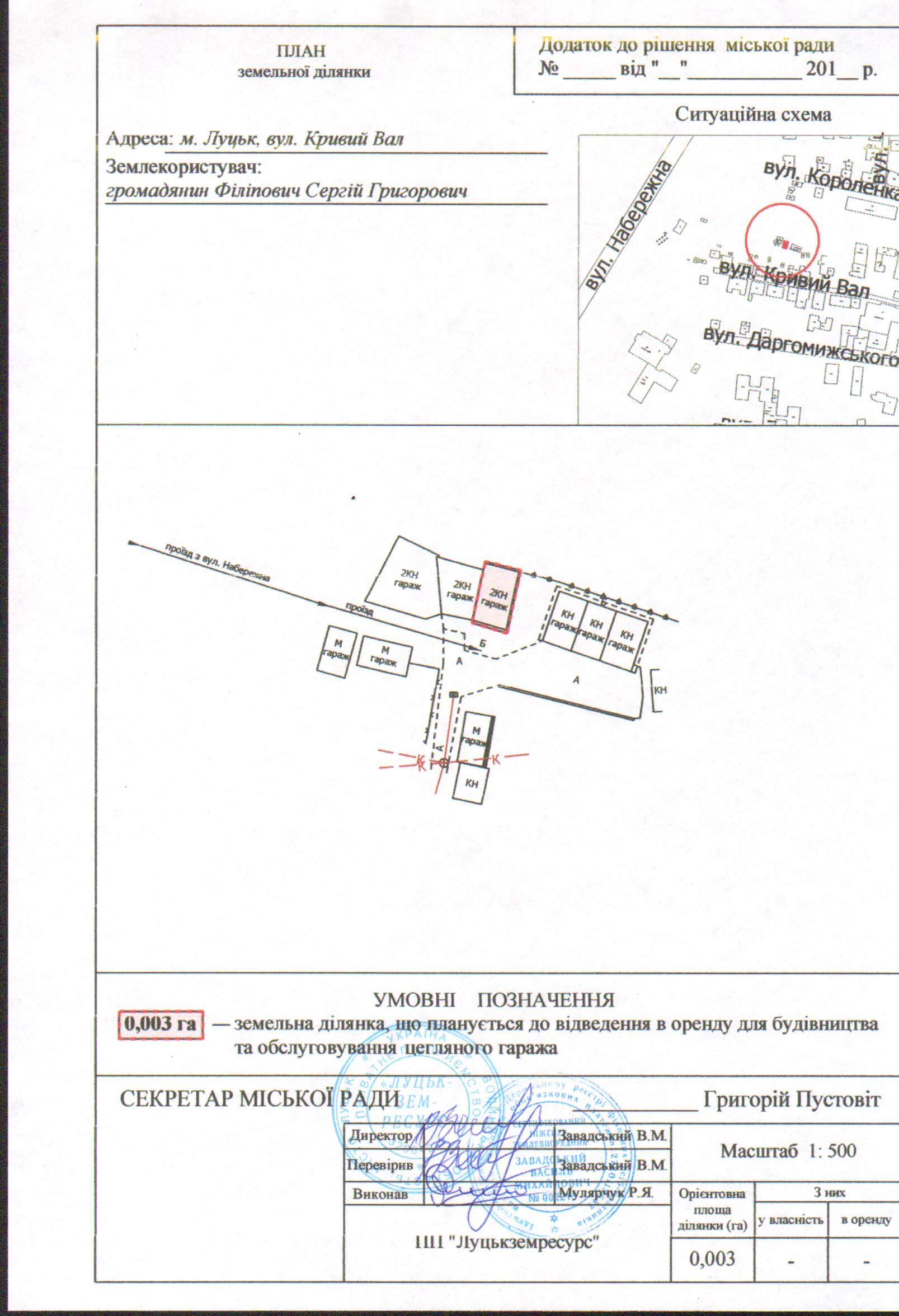 1. Надати громадянину Філіповичу Сергію Григоровичу дозвіл на розроблення проекту землеустрою щодо відведення земельної ділянки на умовах оренди для будівництва та обслуговування цегляного гаража на вул. Кривий Вал, орієнтовною площею 0,003 га, з земель комунальної власності, згідно з додатком.