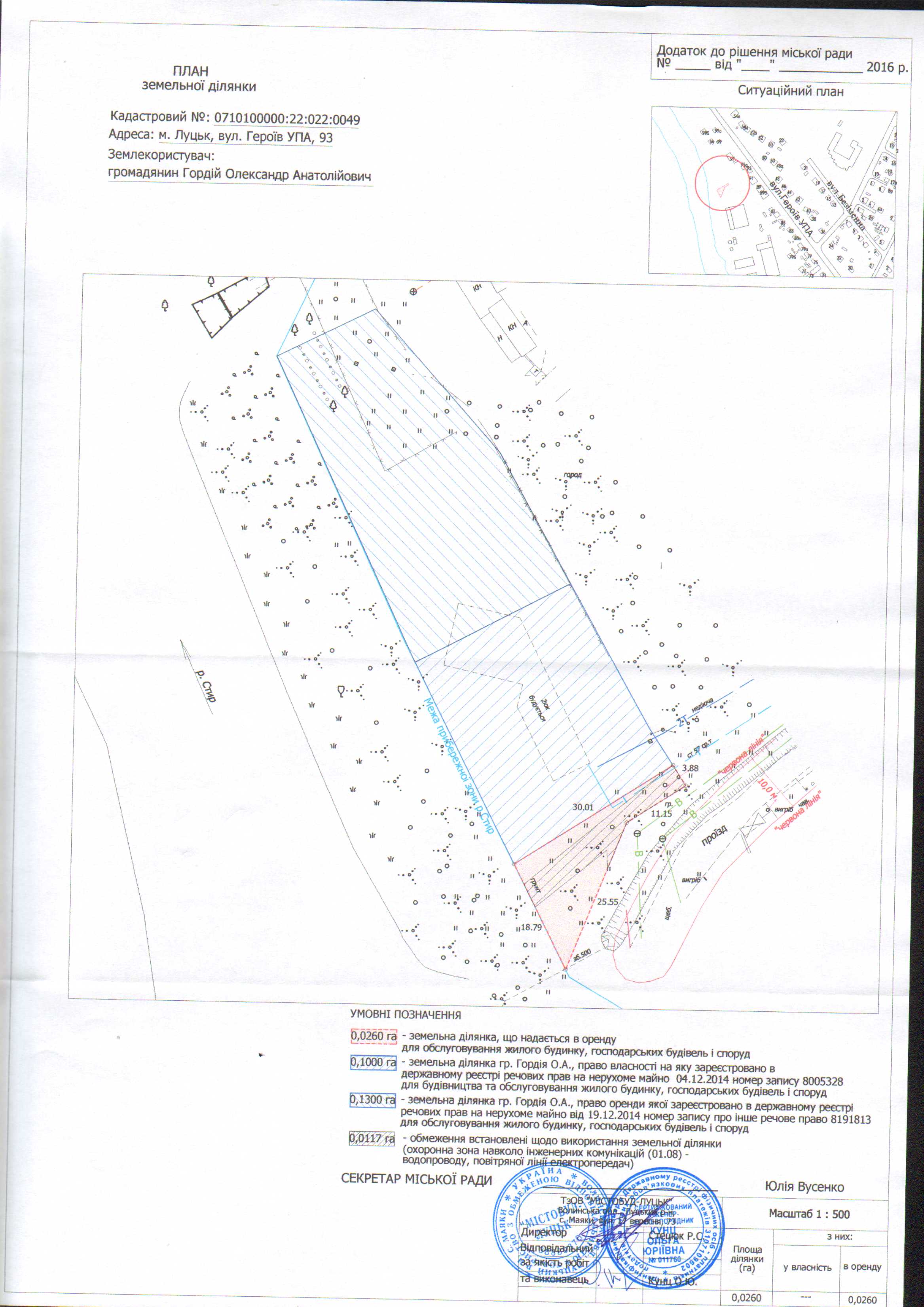 1. Затвердити громадянину Гордію Олександру Анатолійовичу проект землеустрою щодо відведення земельної ділянки на вул. Героїв УПА, 93, площею 0,0260 га, кадастровим номером 0710100000:22:022:0049, для обслуговування жилого будинку, господарських будівель і споруд.