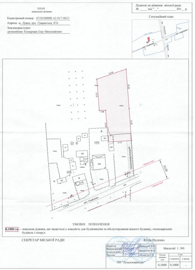 2. Надати громадянину Комариці Ігору Миколайовичу у власність земельну ділянку на вул. Гущанській, 87д площею 0,1000 га, кадастровим номером 0710100000:42:017:0021 для будівництва та обслуговування жилого будинку, господарських будівель і споруд, згідно з додатком.