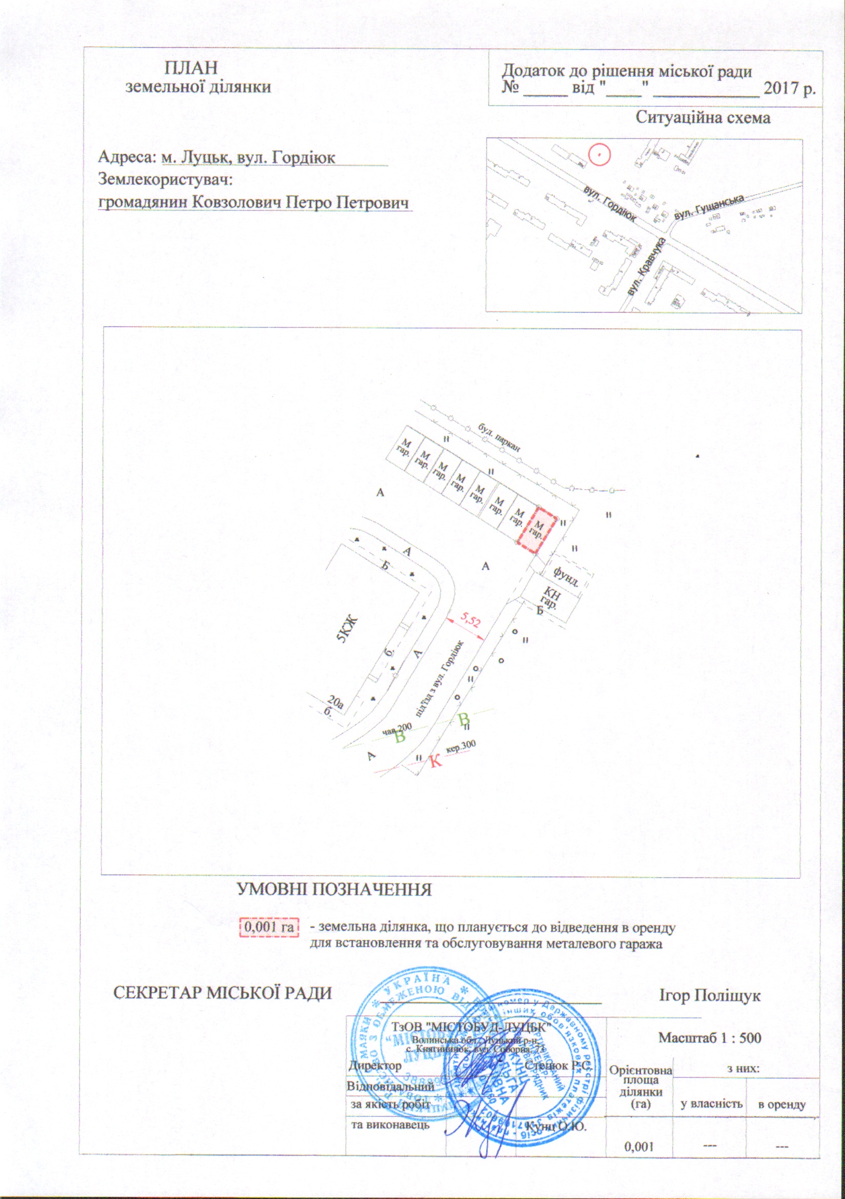 1. Надати громадянину Ковзоловичу Петру Петровичу дозвіл на розроблення проекту землеустрою щодо відведення земельної ділянки на умовах оренди для встановлення та обслуговування металевого гаража на вул. Гордіюк, орієнтовною площею 0,001 га, з земель комунальної власності, згідно з додатком.