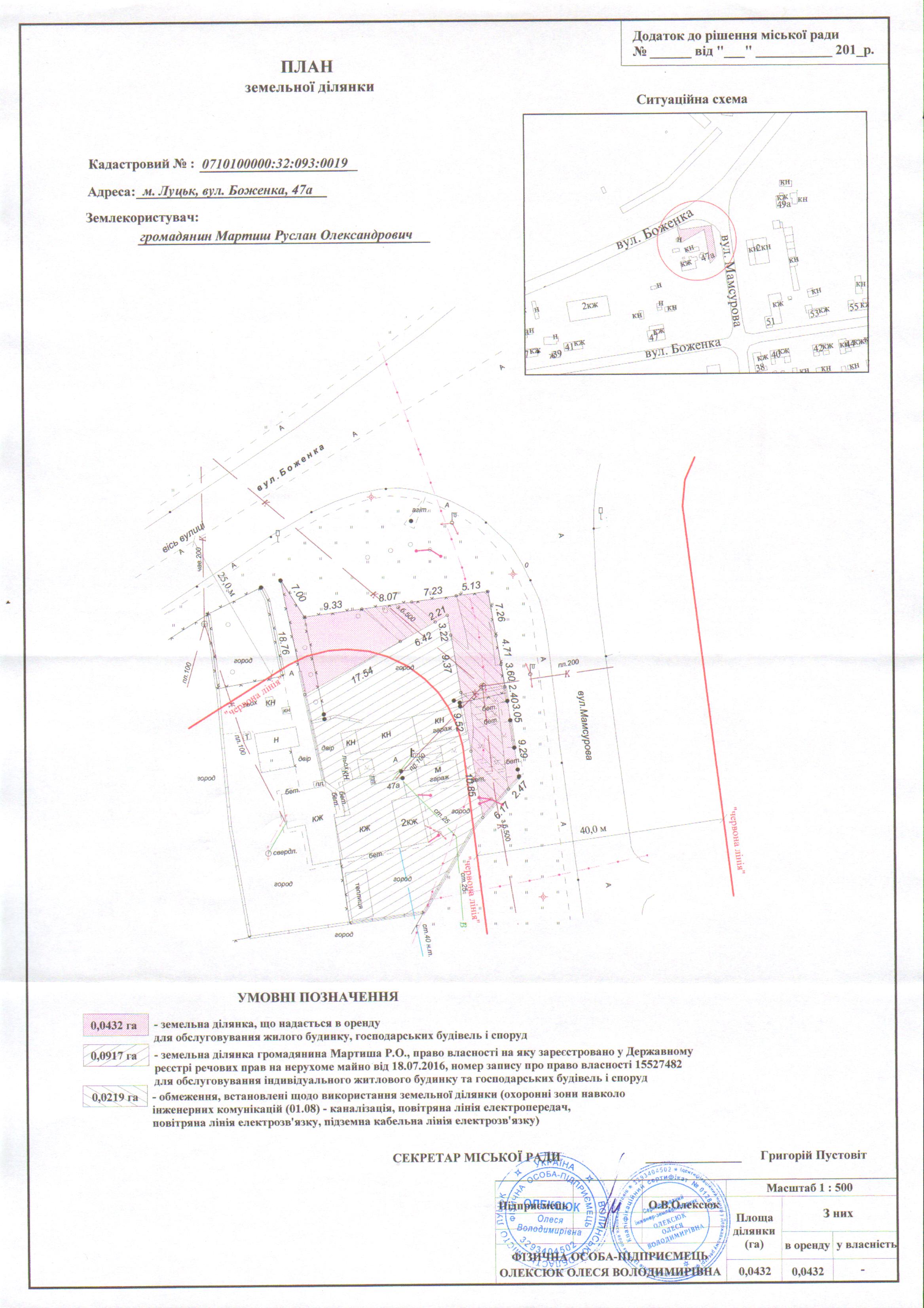 1. Затвердити громадянину Мартишу Руслану Олександровичу проект землеустрою щодо відведення земельної ділянки на вул. Боженка, 47а площею 0,0432 га, кадастровим номером 0710100000:32:093:0019, для обслуговування жилого будинку, господарських будівель і споруд.