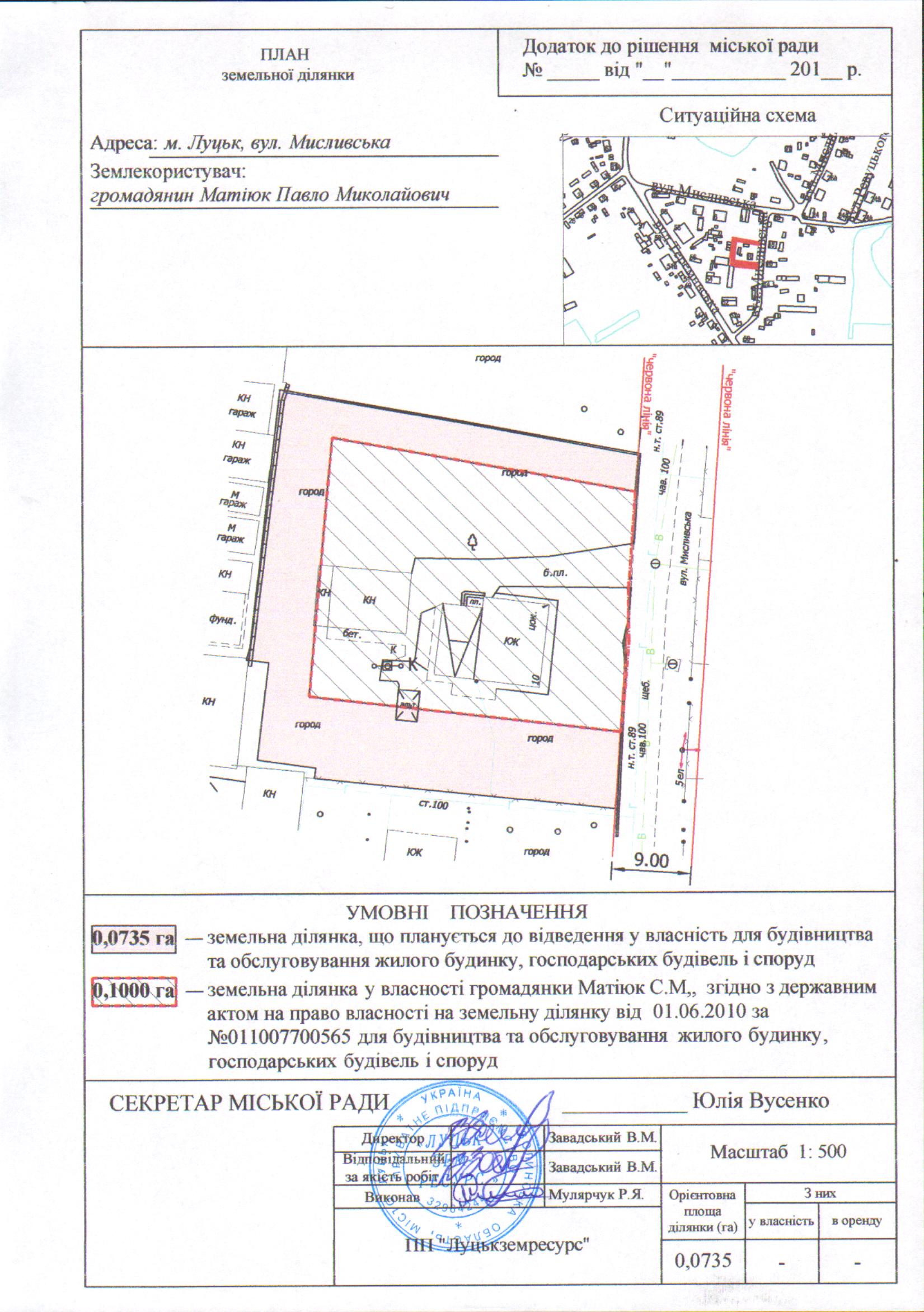 1. Надати громадянину Матіюку Павлу Миколайовичу дозвіл на розроблення проекту землеустрою щодо відведення земельної ділянки у власність для будівництва та обслуговування жилого будинку, господарських будівель і споруд на вул. Мисливській орієнтовною площею 0,0735 га, згідно з додатком. Проект землеустрою щодо відведення земельної ділянки подати для розгляду та затвердження у встановленому порядку.