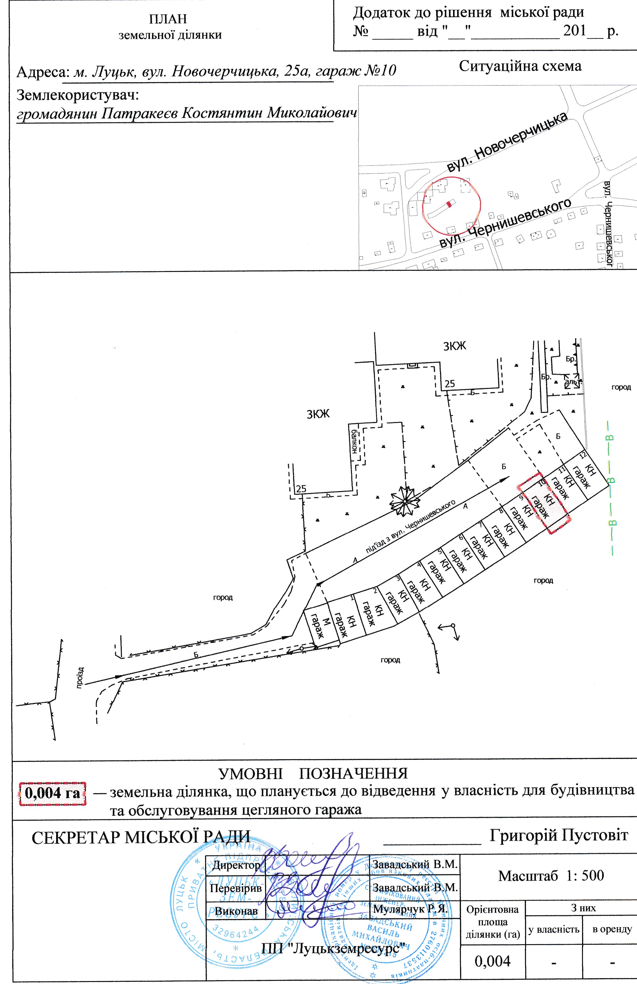1. Надати громадянину Патракеєву Костянтину Миколайовичу дозвіл на розроблення проекту землеустрою щодо відведення земельної ділянки у власність для будівництва та обслуговування цегляного гаража на вул. Новочерчицькій, 25а, гараж №10, орієнтовною площею 0,004 га, згідно з додатком. Проект землеустрою щодо відведення земельної ділянки подати для розгляду та затвердження у встановленому порядку.