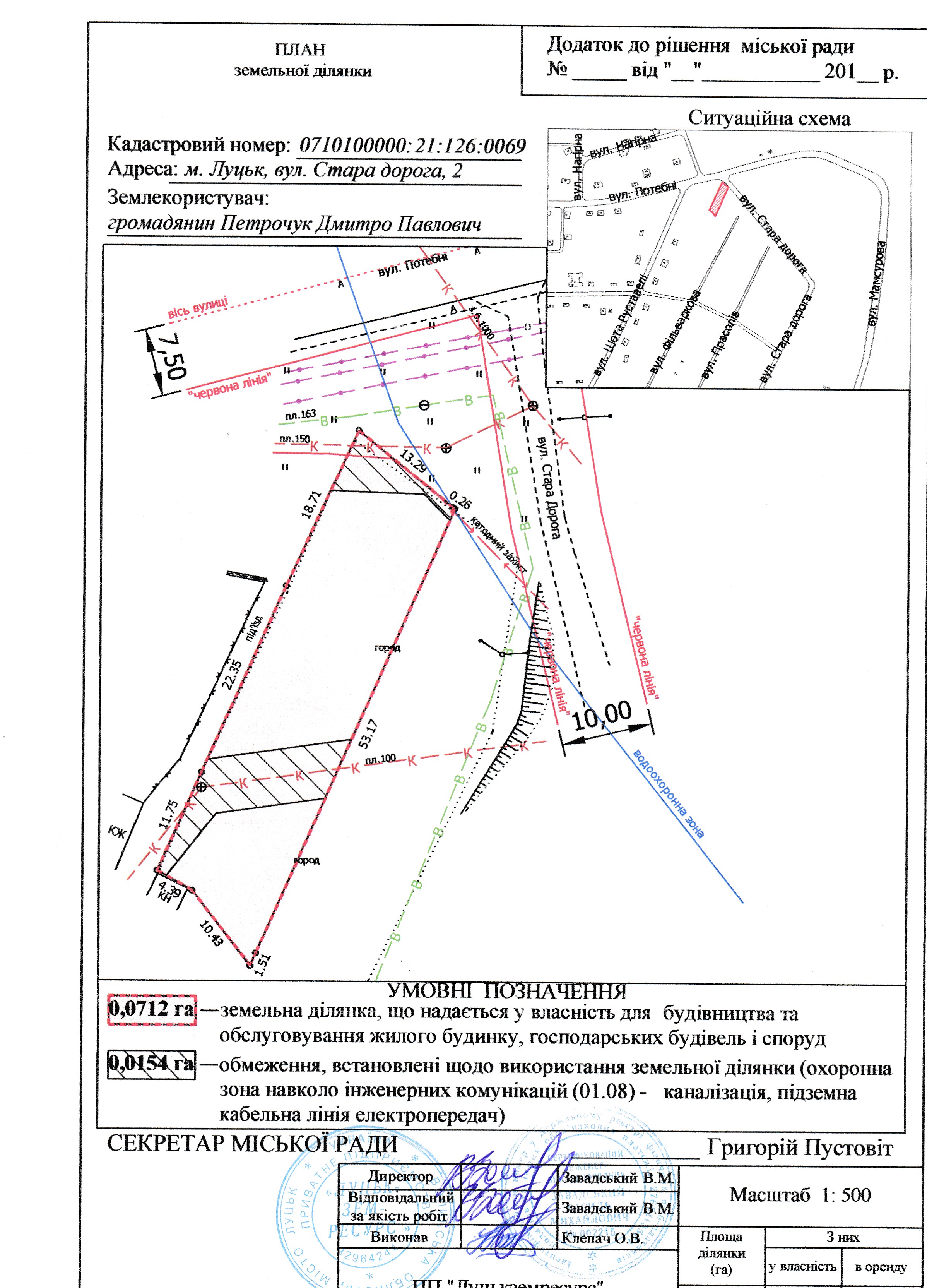 2. Надати громадянину Петрочуку Дмитру Павловичу у власність земельну ділянку на вул. Стара дорога, 2 площею 0,0712 га, кадастровим номером 0710100000:21:126:0069 для будівництва та обслуговування жилого будинку, господарських будівель і споруд, згідно з додатком.