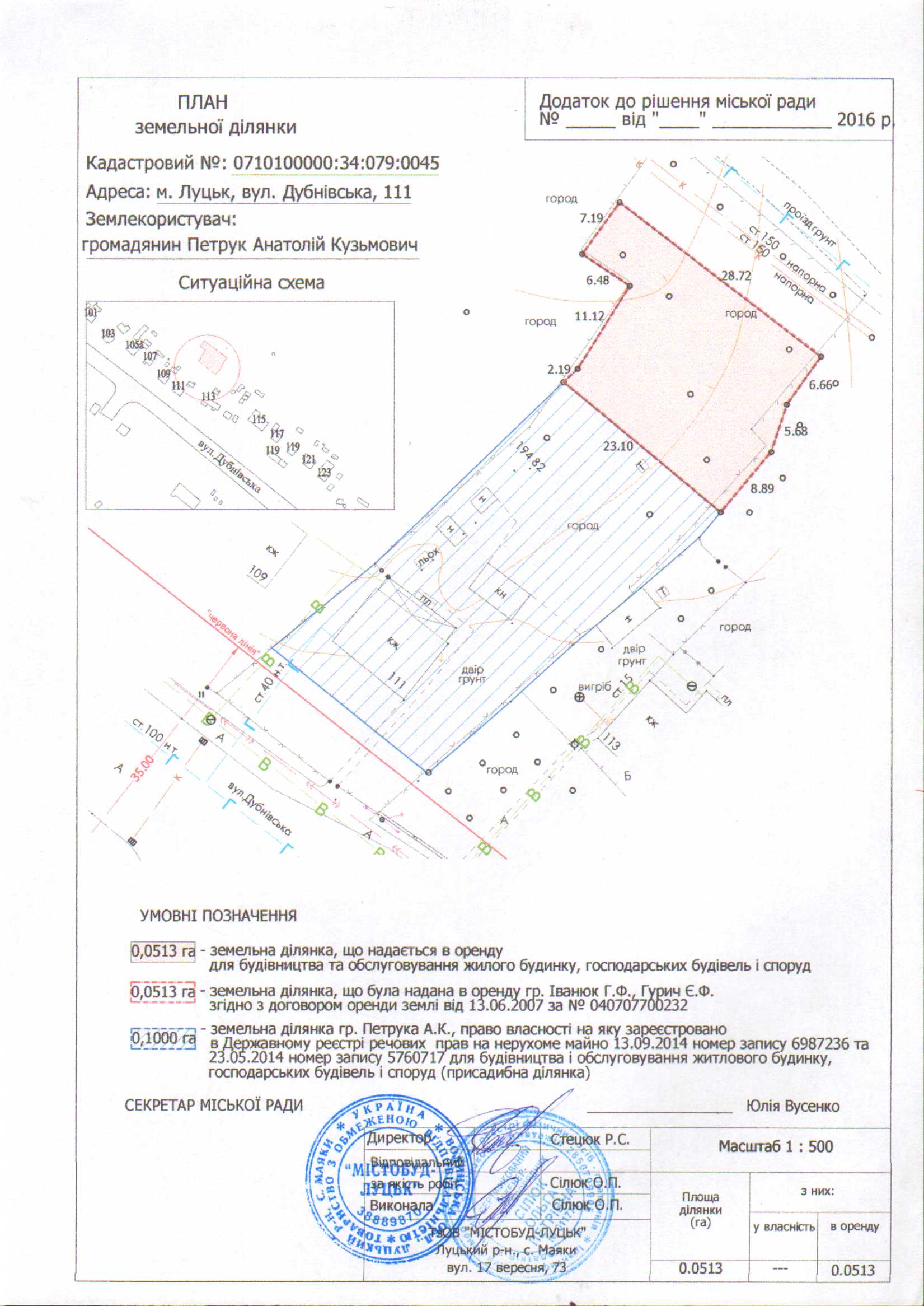 2. Надати громадянину Петруку Анатолію Кузьмовичу земельну ділянку на вул. Дубнівській, 111, на умовах оренди строком на 25 років, площею 0,0513 га, кадастровим номером 0710100000:34:079:0045, для будівництва та обслуговування жилого будинку, господарських будівель і споруд, з земель комунальної власності, згідно з додатком.