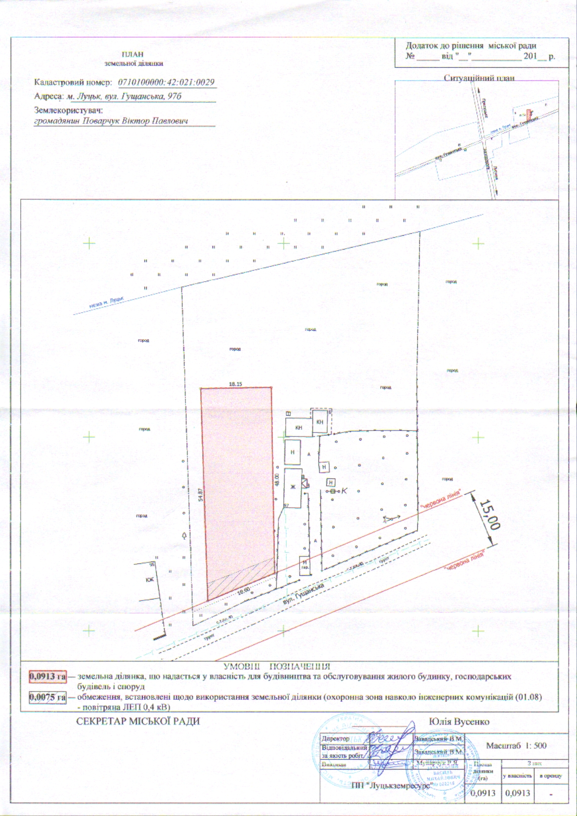 2. Надати громадянину Поварчуку Віктору Павловичу у власність земельну ділянку на вул. Гущанській, 97 б площею 0,0913 га, кадастровим номером 0710100000:42:021:0029 для будівництва та обслуговування жилого будинку, господарських будівель і споруд, згідно з додатком.