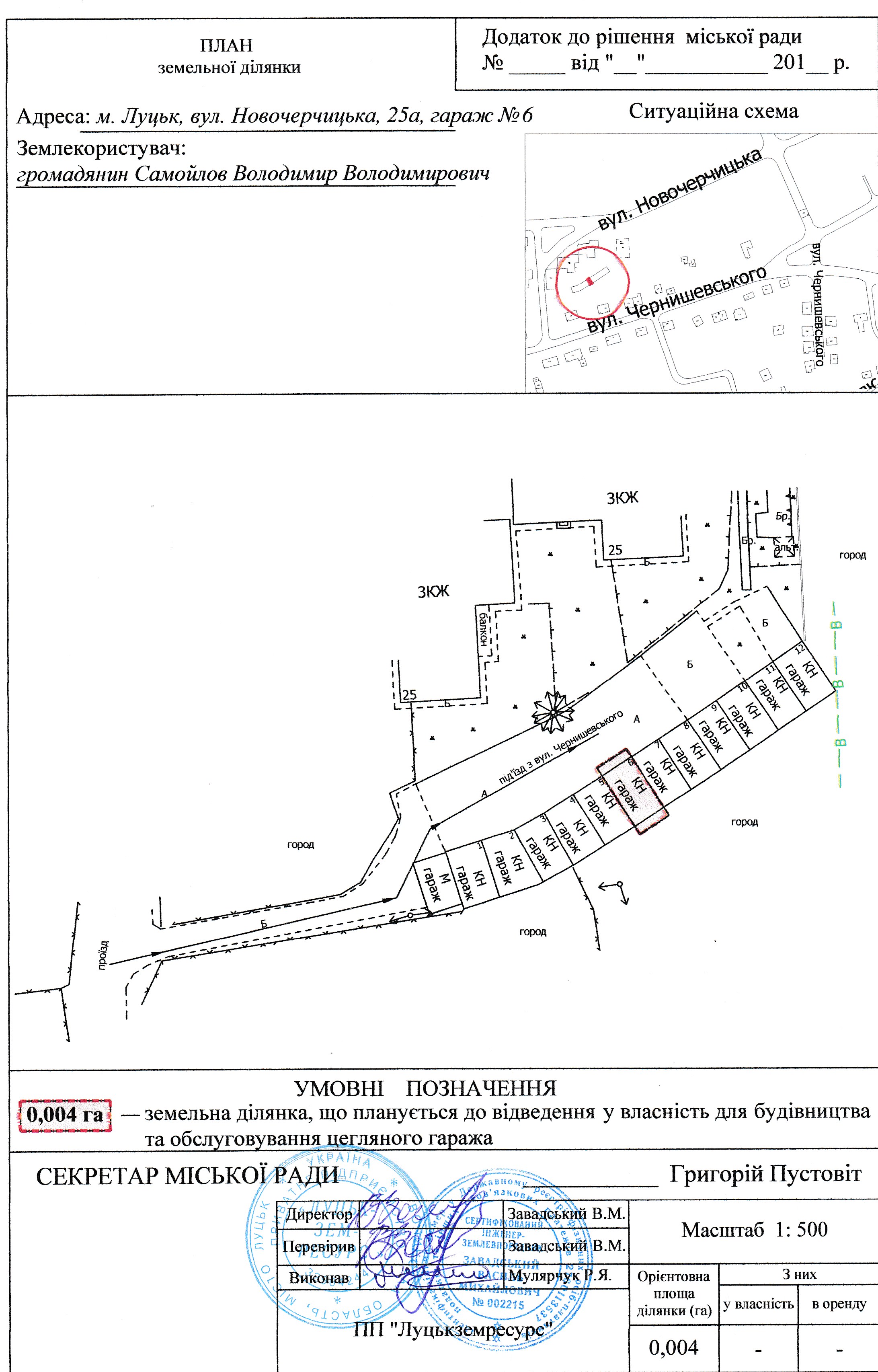 1. Надати громадянину Самойлову Володимиру Володимировичу дозвіл на розроблення проекту землеустрою щодо відведення земельної ділянки у власність для будівництва та обслуговування цегляного гаража на вул. Новочерчицькій, 25а, гараж №6, орієнтовною площею 0,004 га, згідно з додатком. Проект землеустрою щодо відведення земельної ділянки подати для розгляду та затвердження у встановленому порядку.